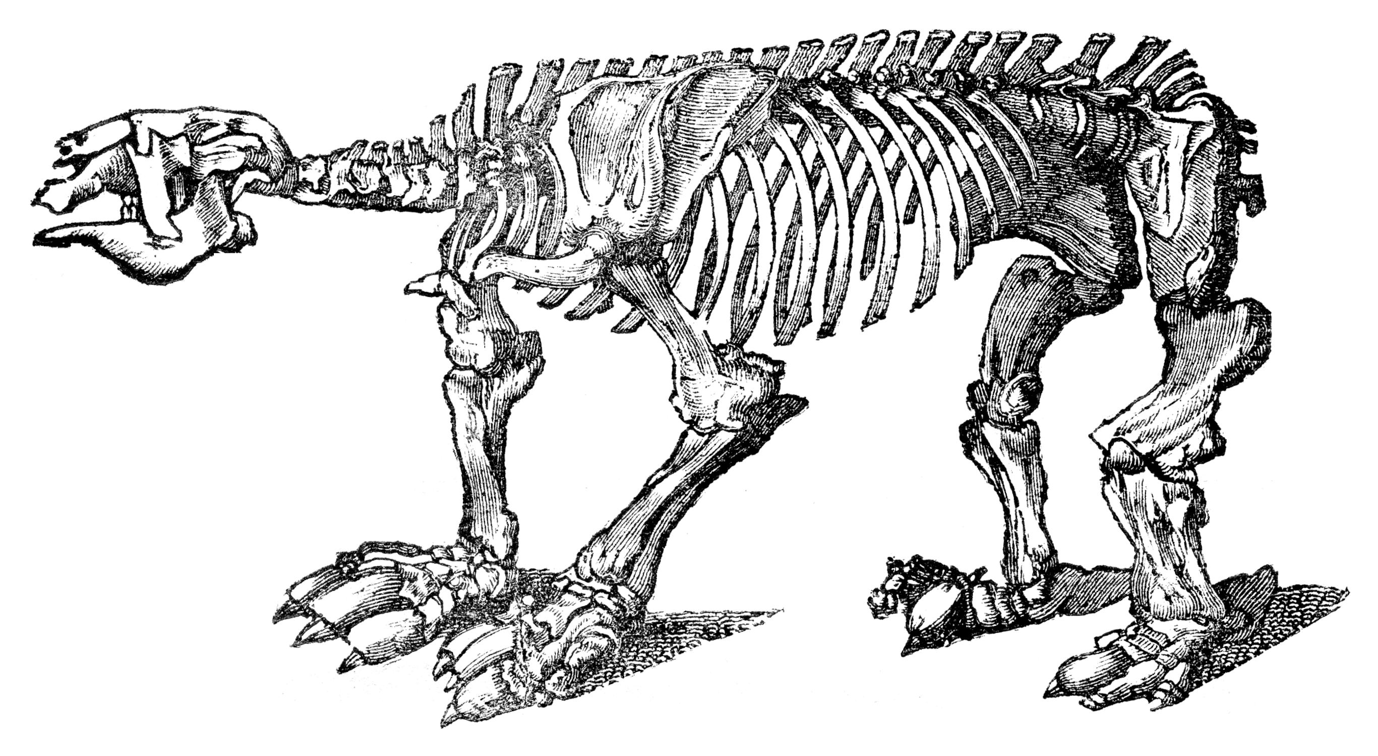 According to the methods of the naturalists, from the circumstance of this animal wanting the front teeth, we should class it with the Edentés of Cuvier, and, following that author, place it along with the megalonyx (having large claws). This latter animal, also extinct, President Jefferson described as a great lion, higher in limbs than our largest ox, and the enemy of the grand mastodon, thereby presenting a terrific idea of the ancient world. But Cuvier, by his knowledge of anatomy, proved it to have been a vegetable feeder, and to be properly classed with the tardigrade animals, a harmless race.