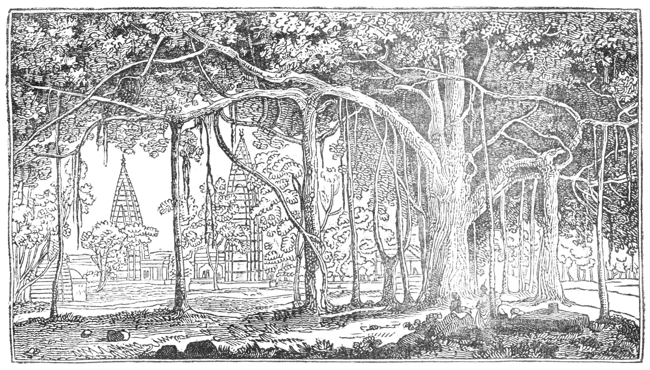 Some specimens of the Indian fig-tree are mentioned as being of immense magnitude. One near Mangee, twenty miles to the westward of Patna, in Bengal, spread over a diameter of 370 feet. The entire circumference of the shadow at noon was 1116 feet, and it required 920 feet to surround the fifty or sixty stems by which the tree was supported. Another covered an area of 1700 square yards; and many of almost equal dimensions are found in different parts of India and Cochin China, where the tree grows in the greatest perfection. A particular account of the banian-tree (sometimes called the pagod-tree) is given in Cordiner’s ‘Ceylon.’ Mr. Southey has also described it both in the spirit of a poet and a naturalist. The cut given above, which is copied from Mr. Daniell’s splendid work on ‘Oriental Scenery,’ well illustrates this description:—