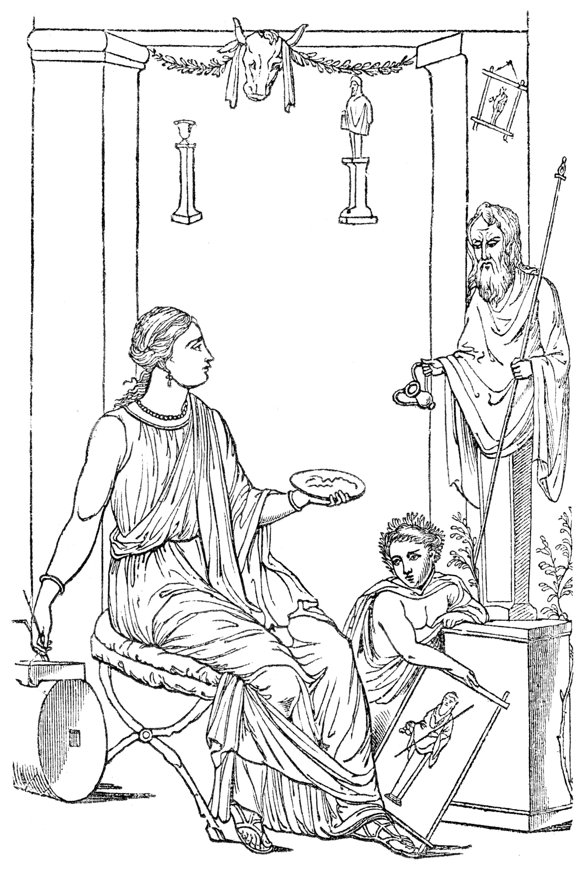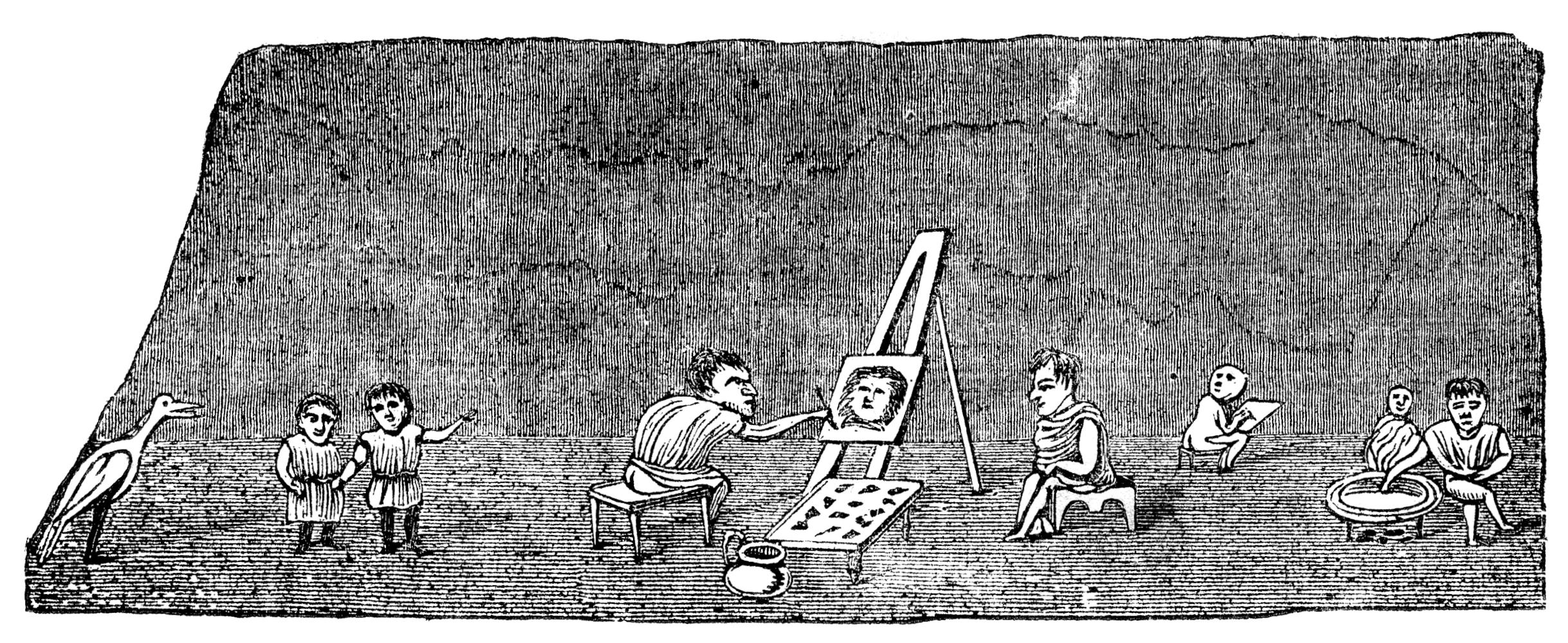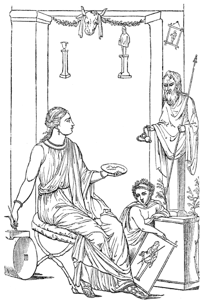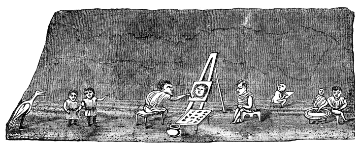 During the progress of the excavations at Pompeii, a painting was found in the Casa Carolina, which scarcely held together to be copied, and fell in pieces upon the first rain. It is of grotesque character, and represents a pigmy painter whose only covering is a tunic. He is at work upon the portrait of another pigmy, clothed in a manner to indicate a person of distinction. The artist is seated opposite to his sitter, at an awful distance from the picture, which is placed upon an easel, similar in construction to ours. By the side of the artist stands his palette, which is a little table with four feet, and by it is a pot to wash his pencils in. He therefore was working with gum, or some sort of water-colours: but he did not confine himself to this branch of the art, for to the right we see his colour-grinder, who prepares in a vessel placed on some hot coals, colours mixed with wax and oil. Two amateurs enter the studio, and appear to be conversing with respect to the picture. On the noise occasioned by their entrance, a scholar seated in the distance turns round to look at them. It is difficult to explain the presence of the bird in the painting-room. The picture is not complete: a second bird, and on the opposite side a child playing with a dog, had perished before Mazois (an artist who has preserved some of the most valuable remains at Pompeii) copied it. This picture is very curious, as it shows how few things, in the mechanical practice of painting, have been changed during 2000 years.