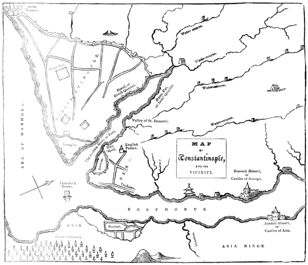 The ground it occupies is marked out by nature as the site of a great city. A gently declining promontory, secured by narrow seas, at the east of Europe, stretches out to meet the continent of Asia, from which its extreme point is separated by so narrow a strait that in a quarter of an hour a boat can row from one continent to the other. This strait or channel, which is called the Bosphorus, running about fifteen miles from the Black Sea, between the beautiful shores of Europe and Asia, looks like a stately river, until it sweeps by the angle of Constantinople and enters the sea of Marmora. But just before it is lost in that sea, it makes a deep elbow to the right, flowing between the triangle of Constantinople Proper, and its suburbs of Galata and Pera, and forming the port which is called the Golden Horn. This is the most convenient as well as the most beautiful harbour in the world.