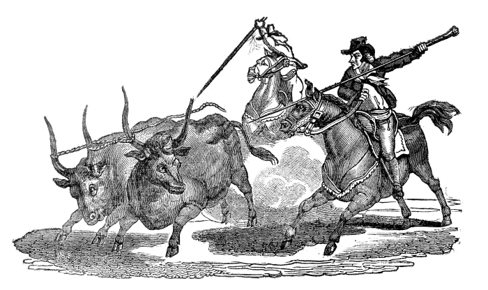 The only stationary population in the Maremma consists of the cow and buffalo keepers, and forest rangers. The former are always mounted and armed with a lance, with which they keep in respect the wild cows and fierce bulls, which are let to roam about these solitudes. These keepers lead a life of freedom and independence, like that of the Arabs in the desert; they are paid by yearly wages, besides which they generally rear up cattle of their own, which are allowed to feed with the rest. They retire in the summer months to the shady forests which line the sea-shore, and where the air is not so unwholesome as in the open plains. There, also, criminals escaped from the pursuits of justice take shelter, and are sometimes employed as wood rangers or buffalo drivers by the people of the neighbouring farms. The following cut, as well as that at the head of this article, represents the mode of driving cattle to the towns.