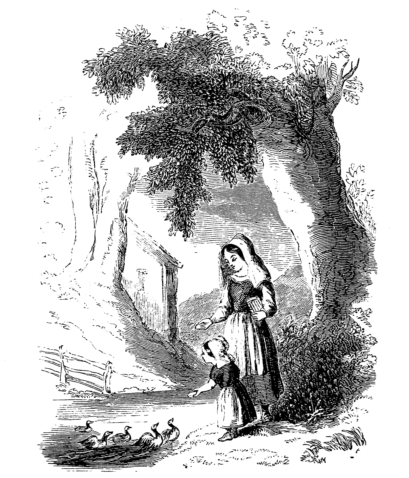 When school was done, Mary called her little boys and girls to come and sit around 53her while she read to them the Bible. She read to them about God creating the world; and how he made the heavens, and the bright stars, and the earth and all the people that live on it, and the flowers, and the birds and beasts, and every thing that has life. And then she read to them about Adam, the first man, and Eve, the first woman, and about the beautiful garden, called the garden of Eden, where they lived, and where they were very happy, until they were disobedient; and because they were disobedient they had to go out of the beautiful garden of Eden.