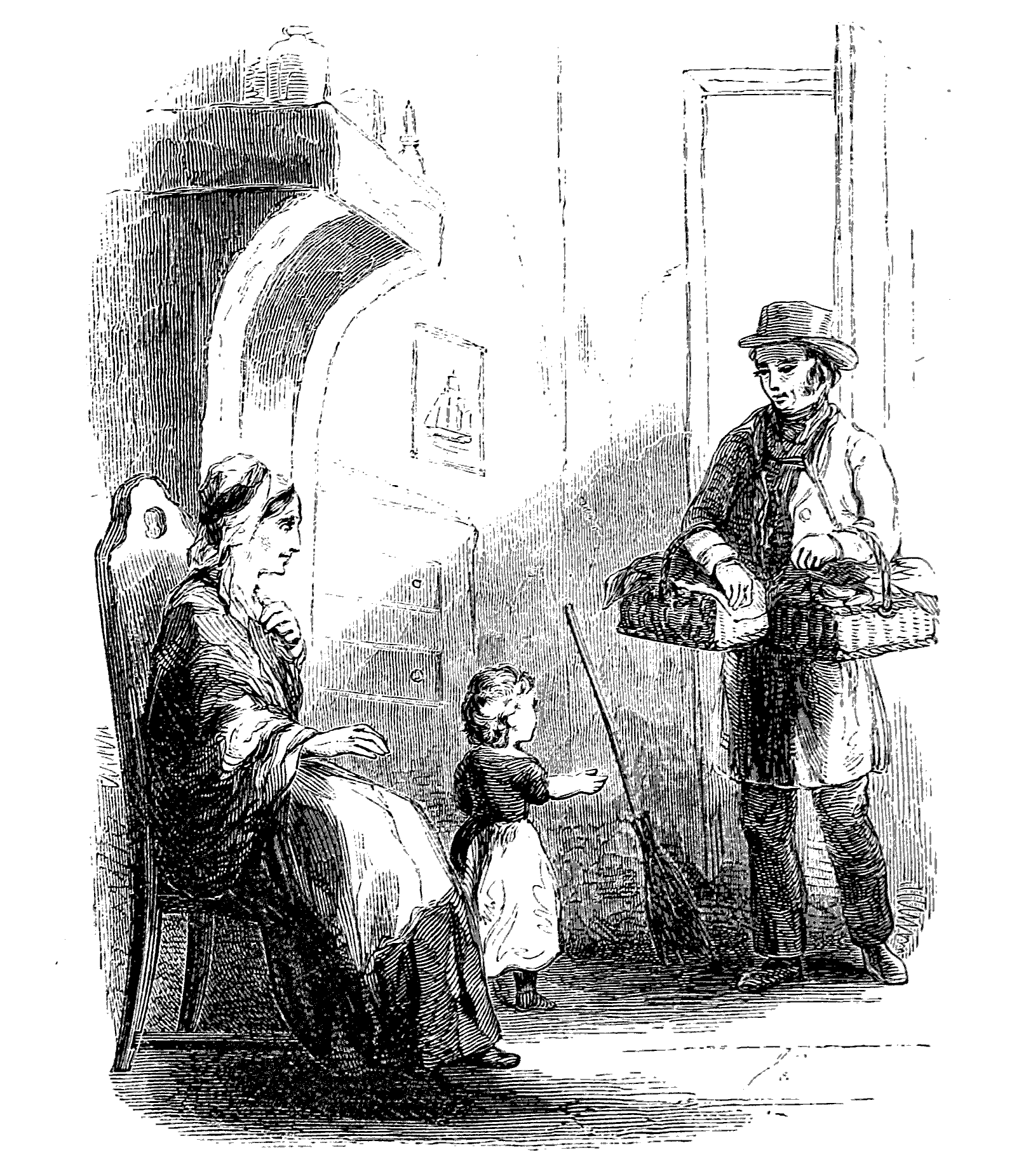 Mary’s scholars thought the muffin-man was very good and kind. There was a picture over the story, and Mary showed them the picture. After they had talked about the poor sailor’s wife, and the little child, and the muffin-man, Carry Deacon asked, “Why the people did not make muffins at home?” Mary told her, “That in large cities, such as Boston, New York and Philadelphia, the 51people who lived there bought many things, which the country people made at home. They bought their milk and their butter and their meat and their eggs, because the houses were built up closely together, and there was not room enough, in towns, to keep cows and pigs and chickens. Mary asked Carry if she had never seen people carrying milk and bread and fruit about, when she was in Philadelphia.” Carry said, “Yes, she had seen a man carrying a bucket with bright hoops around it; and her aunt, at whose house she stayed, told her the bucket had milk in it.” And Carry said, “She saw a woman carrying oranges in a basket, and the woman knocked at people’s doors, and asked them to buy her oranges.”