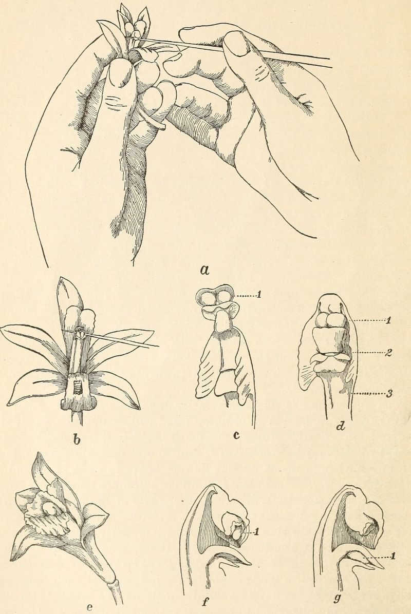 Fig. 1.—Hand pollination of the vanilla flower (after A. Delteil, La Vanille, Paris, 1897, Pl. 2). a shows the position of hands, needle, and flower in the operation of pollination, first stage; b, operation of pollination, second stage; c, flower with male organs raised (pollen masses shown at 1); d, flower from which outer parts have been removed, showing pollen masses at 1, stigma at 2, and the gynostemium at 3; e, perfect flower; f, longitudinal section through male and female organs of the flower before hand pollination, showing pollen mass in the anther or male organ at 1; g, similar section after hand pollination, showing the pollen mass applied to the stigma at 1.