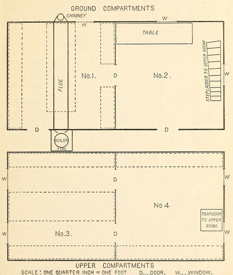 A curing house for preparing a crop up to 2,000 pounds (dry) may have the following dimensions and fixings: 30 feet long, 15 feet broad, 13 feet in height of walls. It should be divided into four compartments, two on the ground and two above, each being approximately 15 by 15 and 6¹⁄₂ feet high. One compartment on the ground floor is used as a hot room, having a flue 2 feet wide covered with sheet iron running through the center. If the heat is too intense from this, sand may be sprinkled on top to reduce it. Above this flue and around two sides of the hot chamber tiers of shelves are fixed 6 inches apart, on which the pods are spread to dry. The shelves may be conveniently made of laths, on top of which mats or canvas can be laid; or fine-meshed wire netting would serve the same purpose, perhaps, better than anything else. The entire arrangement will be more easily understood by reference to fig. 2. Compartment No. 1 is the hot room. Dotted lines in it and in Nos. 3 and 4 indicate where shelves are fixed; D, door; W, window, etc. The table is used for sorting green pods on, and is otherwise useful at final measuring time and when the pods are tied into packets. No. 3 is above No. 1, and is also a warm room, some heat from No. 1 coming up through the floor. The clear spaces in Nos. 2 and 4 have fiber mats spread on them when required, and on these the pods are handled and sorted as they progress in curing. The worker, sitting on the floor, keeps the four lots of pods—long, medium, short, and split—distinct on the shelves. This facilitates the sorting, the short and split pods needing to be examined sooner and oftener than the longer and sound sorts, as they dry more rapidly.