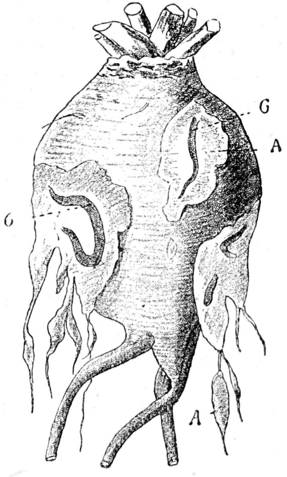 Preventive Measures: Manufactured compost must not be used as a manure on beet-fields. The refuse from infested beets, if used on other fields, must be mixed with one-sixth its bulk of quicklime. The boots of labourers employed in beet-sick fields, the hoofs of horses working in them, and also the implements used, must be carefully cleansed lest infected earth should be carried to other fields. Remedies: Kühn has recommended the use of plants which attract the eelworms (“lure-plants”). He sows on beet-sick land rapidly germinating plants, of kinds which the worms readily attack, and weeds them out again when they have become infested by the parasites, but before these have had time to mature and re-enter the soil. The eelworms are thus allured into the plants grown, and destroyed with them. Such 230lure-plants must be sown as thickly as practicable, so that the soil may be penetrated by as many slender rootlets as possible. After these plants have been dug up, a second lot should be grown, since all the eelworms will not have attacked the first lot; and it is even advisable to grow a third batch. Kühn used as lure-plants the various kinds of cabbage, also summer rape (Brassica rapa), since this plant has a great attractive power for the beet eelworms, and can hold a large number of them in its numerous, much branched rootlets. I cannot go into all Kühn’s researches here, and will only mention the following. In the course of the year 1880 part of a beet-sick field had three successive crops of lure-plants grown upon it, each being dug up from thirty to forty days after sowing. The field was ploughed in autumn, suitably manured the next spring, and sown with beet in the middle of April. The other part of the piece of land was treated in exactly the same way, except that no lure-plants were grown upon it. A difference was very soon seen between the two plots, and there was a very great difference at the time the crop was ready to be gathered in. The plants on all parts of the first plot were in a flourishing condition, but those on the second plot were in many places either killed outright or else small and misshapen. The crop succeeding the lure-plants was three times as great as it had been before, and almost equal to that of a healthy field. Later on, Kühn made an important discovery; he found that larvæ which have reached the thickened motionless stage, depicted in Fig. 134, 5, require a considerable amount of food to keep them alive, and enable them to develop further. If the plants are disturbed in such a way as to kill the rootlets containing the larvæ in this stage, these are unable to develop any further. Kühn caused a kind of horse machine to be made, adapted for rapidly destroying the lure-plants in the fields. For further details, his original memoirs may be consulted.
