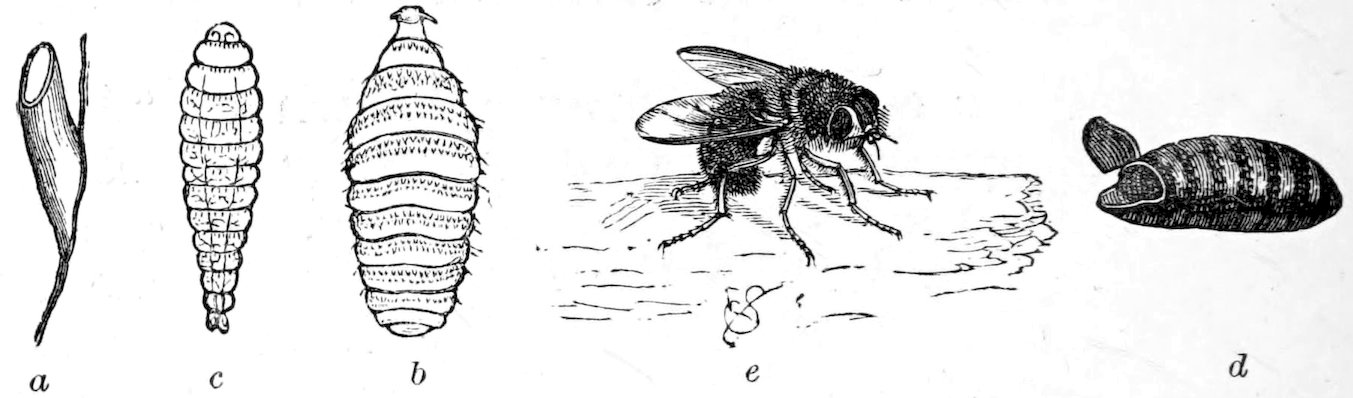 Flattened parasitic worms, tongue-shaped or leaf-shaped, living on or in a host, and provided with one or two ventral suckers. The intestine forks into two branches immediately behind the gullet, and these two divisions in some species (e.g. the large liver-fluke) branch again repeatedly in a tree-like fashion. Anus and blood-vessels absent. Almost all flukes are hermaphrodite; they fertilize themselves. All the forms living within a host (i.e. endoparasitic forms) lay an immense number of small eggs, from which larvæ are hatched that become asexually reproducing animals. These or their progeny produce once more the sexual form. The development is therefore an example of metagenesis (p. 16), but there is a change of host. Only the two liver-flukes need be dealt with here.