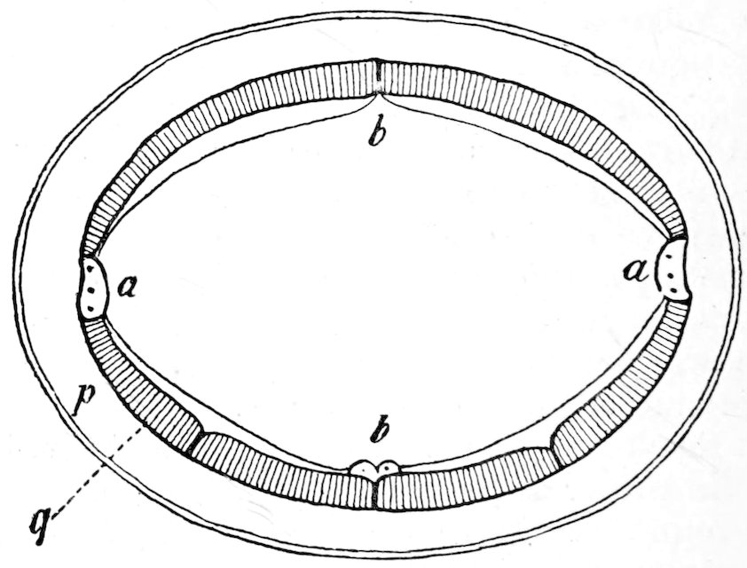 The external characters of an ordinary tapeworm may be gathered from Figs. 135 and 136. A very small “head” continued behind into a small “neck” can be distinguished, and a very large number of joints, of which the first are very small and short, while those which follow get larger and larger the further they are from the head. The tapeworm at first consists only of a head which holds on to the lining of the intestine by means of suckers or similar structures. The hinder part of the head next elongates to form the so-called “neck,” and a cross-wall is quickly developed a little way in front of the hind end of this neck. By this division is formed the first joint, which, though forthwith tolerably independent, remains attached to the neck of the tapeworm head, until a new joint is separated off from the hinder part of the neck, immediately in front of the first joint. Every new joint is similarly formed by the constriction of the hinder part of the neck. Each joint possesses a complete set of hermaphrodite reproductive organs; it becomes sexually mature without reference to other joints, breaks off, and creeps about, even for considerable distances, and finally ruptures, so that the numerous eggs are liberated. Each joint may therefore be regarded as an individual, though the tapeworm, considered as a whole, also possesses a certain individuality. The tapeworm is a species of animal which exists in two forms. One of these is the sexually reproducing joint, which leaves the original host, and from the eggs of which are developed larvæ, which become, in another host, bladder-worms, or measles. These develop a head, which is the asexual second form of the tapeworm. This, therefore, is a case of metagenesis (p. 16). It appears, from what has been said, that the head can in no sense be compared to the head of an ordinary animal; it has neither mouth nor jaws, for tapeworms do not possess a gut. The head and joints take up osmotically through their walls the nutritive matter found in the intestine of their host. There are suckers and, in several species, a circlet of hooks on the head (Fig. 136, a), by which the animal holds fast to the intestinal wall. Thousands, or even tens of thousands, of eggs may be produced by a single joint. The joint is liberated when the eggs begin to ripen, often before. In some species several adjacent joints are pinched off at the same time. The tapeworm joints leave the intestine of their host either alone or with the dung. After falling to the ground they creep along like snails, and attach themselves to various plants. It is obvious that a tapeworm joint or a number of the eggs produced by it may easily be taken up by a grazing animal. The eggs of a particular kind of tapeworm are only able to develop further if they reach the intestine of a particular kind of host. It is undoubtedly true that, as a rule, only a relatively small number of the eggs produced by a tapeworm develop further, but the great powers of reproduction prevent the species from dying out. If, now, either a joint or the eggs from one are taken into the gut of a suitable host, the joint and the egg-shells, or the latter only, as the case may be, are digested in the stomach or intestine, so that the larvæ are set free. These (Fig. 137) are spherical, glass-like, of microscopic size, as might be expected, and bear three pairs of hooklets, by means of which they quickly perforate the wall of the gut, and make a way through the tissues of the host. They may also be carried further by the blood-stream. The larva of a particular species settles down finally, not only in some particular kind of host, but also in some definite organ or tissue. It then loses its hooks, and is rapidly transformed into a hollow bladder-worm (measle), which grows till it reaches a definite size, depending on the species. Meanwhile it gradually develops one (Cysticercus) or several (Cœnurus) ingrowths, or (in Echinococcus, Fig. 138) several new bladders are developed inside the bladder-worm, and ingrowths are usually formed within these, similar to those of the simpler kinds of bladder-worm. These ingrowths resemble tapeworm heads in all respects, possessing suckers, and, it may be, a circlet of hooks, but these are inside, and not outside. Later—either in the animal originally inhabited by the bladder-worm, or after it has been transferred in the flesh of this to the gut of some carnivorous animal—the bladder-worm contracts, so that it can no longer hold the fluid which is present, and the ingrowth is turned inside out, the suckers thus becoming external. The tapeworm head is formed in this way, but the bladder still remains attached to its hinder end (Fig. 139). If a host inhabited by bladder-worms is not devoured by another animal, the bladder-worms, after reaching their full size, remain for a long time in the same stage of development 236without being able to develop further. But if the host is devoured by another animal, the bladder-worms enter its stomach and intestine, where the bladder is digested, while the tapeworm head remains uninjured. This thrusts out its suckers and attaches itself by means of them to the wall of the intestine, the process of joint-formation already described beginning soon afterwards.