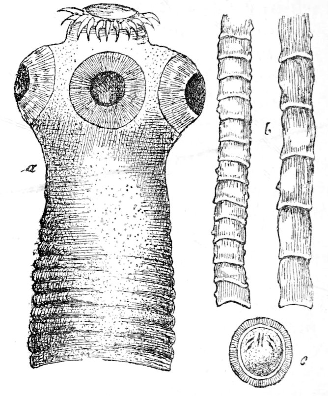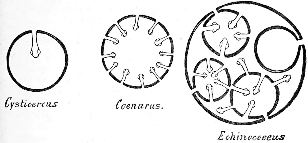 is at most scarcely one-sixth of an inch long, and consists of only three or four joints, often lives in large numbers in the intestine of the dog without injuring its host, but causes huge cysts (from the size of a pigeon’s egg to that of a child’s head) in the liver, lungs, or other organs of man, pig, and ruminants. These cysts are of the type represented 240on the right of Fig. 138. They may prove fatal, owing to the pressure they exert in the organs containing them and the blood-vessels of the same.