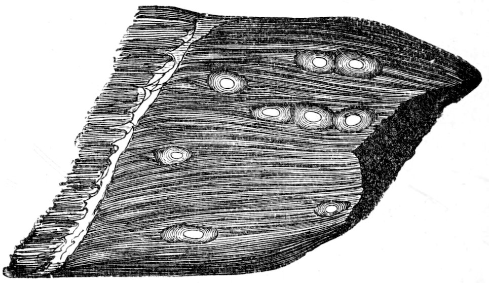 Six to ten feet long, with seven to eight hundred joints, and a circlet of hooks (Fig. 136), lives in the human intestine. Several of its sexually mature joints are commonly pinched off at a time, and if these are picked up from a field or dung-heap by a pig, the contained eggs develop into “pork measles” (Cysticercus, Fig. 140), which are especially abundant in the connective tissue between the muscles, and make the meat “measly.” They may also occur in the connective tissue of other parts (fat, brain, spinal cord). Young pigs not more than six months old are most in danger of becoming measly. A tolerably large number of measles can be borne very well, but if very 237abundant they cause emaciation, weakness, lameness, and poverty of blood. The flesh of an animal badly infested with measles may be pale, watery, or even greasy, while pork not so much diseased may seem all right, though it is really unfit for food, since if eaten in an insufficiently cooked state by human beings it would produce tapeworms. The measles are most abundant in the muscles of the breast and neck, and next to them in those of the hams and shoulders. From twelve to twenty thousand measles may be present in a single pig.