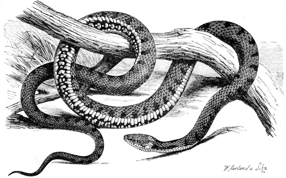 The Large Slug (Limax maximus).—Up to six inches long, with black flecks on the hump-like mantle, and black streaks on the rest of the body.
