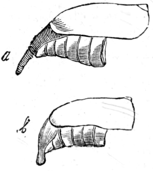 The disease caused by the presence of bladder-worms in the brain is called “gid,” or “sturdy,” also “staggers.” Two stages can be distinguished in it. During the first period the symptoms of disease are chiefly due to the wounds which the larvæ make on the surface of the brain, and the consequent inflammation of the investing membranes. Even in this stage the disease may be fatal, but the symptoms cease as soon as the larvæ cease to move about. The bladder-worms are only able to do harm by the pressure they exert, which is small at first, though it gradually becomes greater. The first stage of gid manifests itself in late summer, the second in late autumn, winter, or spring, according to the rate at which the bladder-worms develop. The symptoms of the first stage are caused by the increased flow of blood to the brain and head generally, resulting from the irritation which the larvæ exert. (Head very hot. Eyes bloodshot. The sheep are sluggish but restless, and carry 239their heads in a strange way, to one side, bent back, or turned up. They often run round in a large circle. There may also be gnashing of the teeth, foaming at the mouth, squinting, convulsive movements, and loss of consciousness.) The symptoms of the disease in its second stage are the result of pressure on the brain and some of the arteries of the brain and skull. (The sheep affected separate themselves from the others, and generally hang their heads. Gaze fixed. Occasional loss of consciousness. Movements strange; run or turn round in a circle. The sheep often staggers and falls to the ground. The bones of the skull become thinner at the place under which the bladder-worm is found, sometimes even as thin as paper.)
