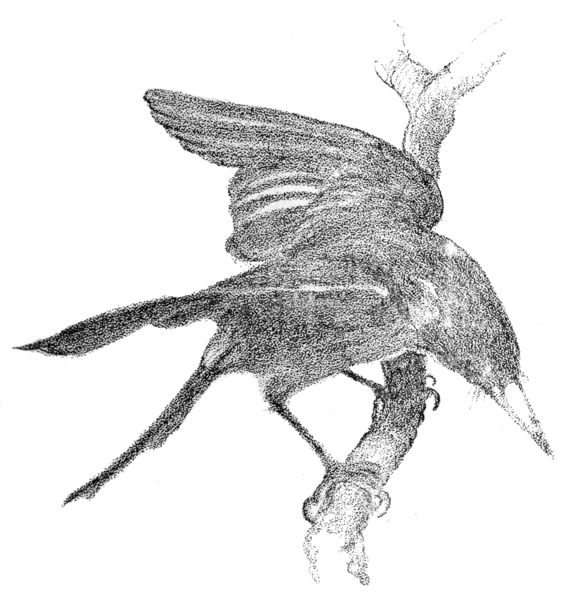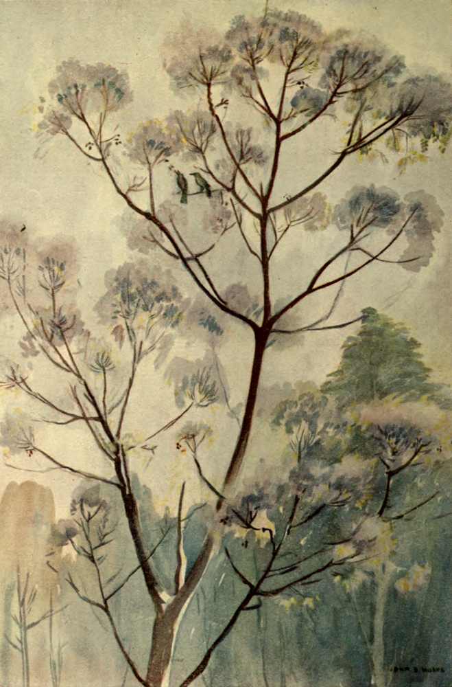 A visitor which has a particular attraction for me is the Lalage. I like his smart coat of black and white and grey, and I like his sweet trilling song, but what I like most is his name—his scientific name. For he is one of the few birds whose scientific name is preferable to the vernacular or the colloquial; Lalage tricolor is far prettier and easier to say than “White-shouldered caterpillar-eater,” or the stupid “peewee lark.” [Pg 17]Other birds that visit us occasionally are parrots. I have noticed five kinds—Rosellas, Mountain Lowrie, Blue Mountain parrots, and two little green lorikeets. They have always come when the eucalypts are in flower, and I love to see their gay bodies flashing against the creamy blossoms as they feed noisily on the honey. If only people would realize how much life and colour they bring to their gardens by retaining food-giving trees, I am sure they would not be so ruthless about cutting down trees to make way for roses and dahlias. No bed of flowers could be so soul-satisfying as the sight of a flock of parrakeets feeding in the honey-laden blossoms of a flower-covered bloodwood.