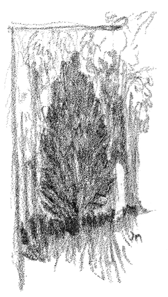 Close by the creek grows one of the loveliest of the wild trees, the native cherry (Exocarpus cupressiformis). There is quite an old-world charm in its formal cypress shape, which seems to reprove the irregular gums and she-oaks; and the gold-green of its tender tips stands out in lovely contrast against the blue-green and silver-grey of the other trees. When the setting sun catches it through the taller tree trunks it glows like a fairy Christmas tree, and one can picture the little folk dancing round it in a ring. It grows at the very edge of the once cultivated plot, and I think the planner of that garden must [Pg 9]have stopped short just there in order to save the lovely thing. Beyond all this is natural bush, with tall spotted pink orchids pushing through in the spring-time, under the golden pultenea and dillwynia, and in summer a white cloud of snowbush.