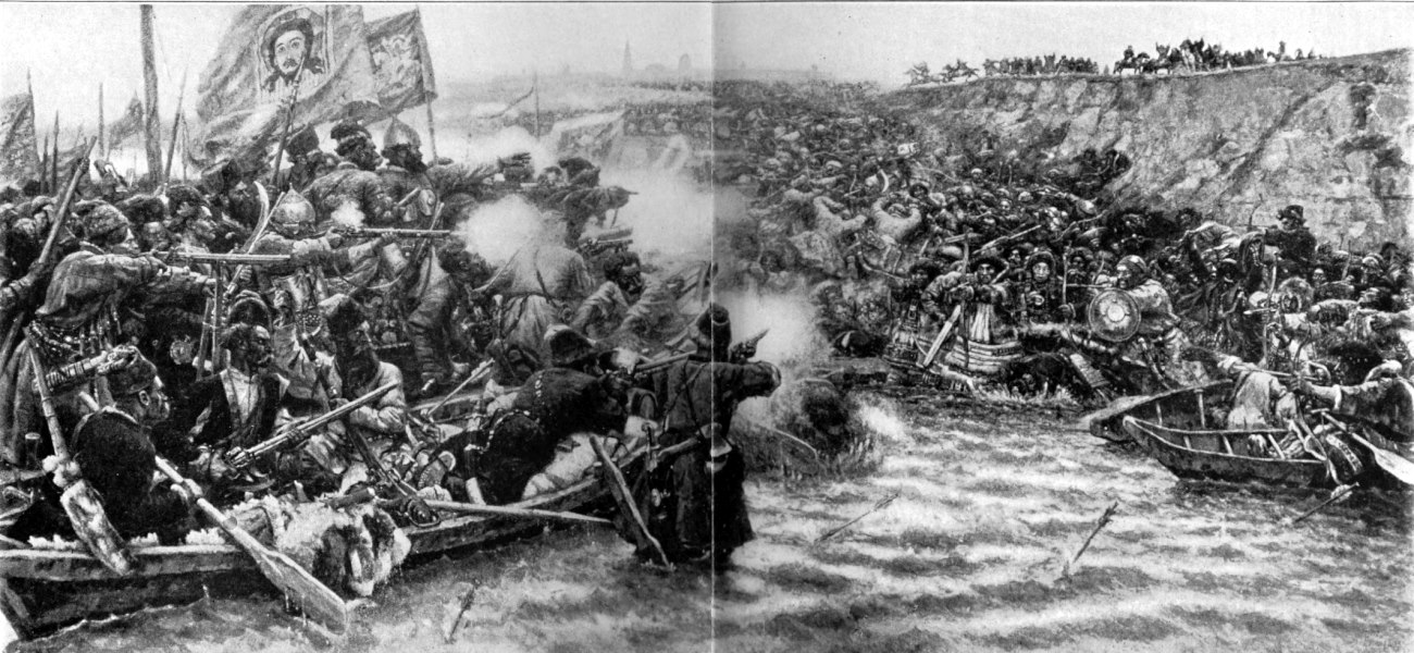 Yermak’s Expedition to Sibir, attacked by the Tatars From a painting by Surikova |