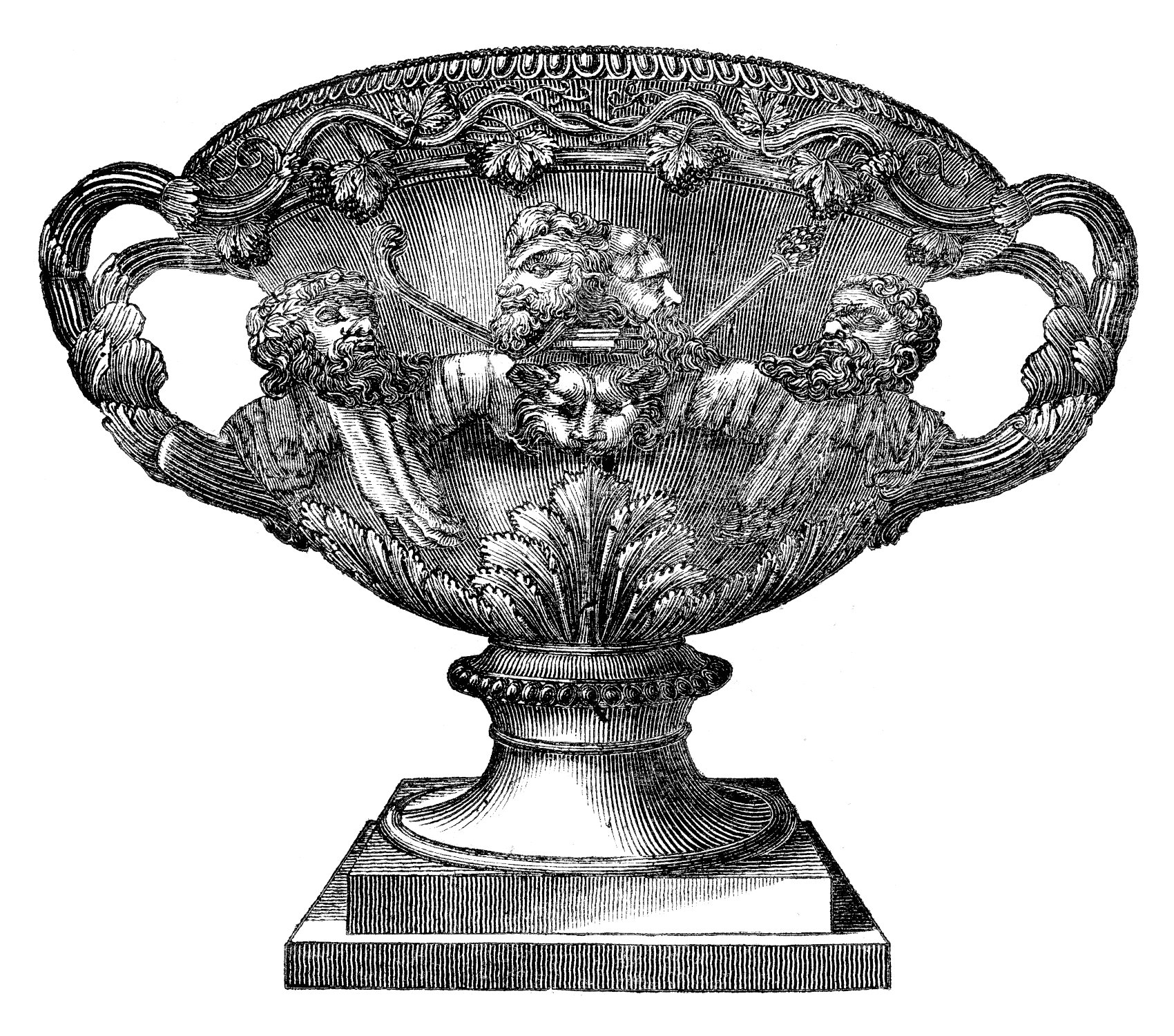 In an account which we recently gave of Warwick Castle, we mentioned the beautiful and celebrated specimen of Grecian art, which now embellishes the grounds of one of the finest monuments of the feudal grandeur of England. There is something extremely captivating to the imagination to witness one of the most exquisite pieces of ancient workmanship, said to be the production of Lysippus, a statuary of the age of Alexander the Great, thus preserved from the ravages of time, amidst the scenes which tell their story of a past age, not so far removed from the present day, but equally recalling lives and actors essentially different from our present habits and modes of thinking. ‘The Warwick Vase’ was dug up from the ruins of the Emperor Adrian’s villa at Tivoli, and was sent to England by the late Sir William Hamilton, in 1774. It is probably one of the most entire, and, to a certain extent, the most beautiful specimen of ancient sculpture which this country possesses. The material of which it is made is white marble. Its form is nearly spherical, with a deep reverted rim. Two interlacing vines, whose stems run into and constitute the handles, wreathe their tendrils, with fruit and foliage, round the upper part. The centre is composed of antique heads, which stand forward in grand relief. A panther’s skin, with the thyrsus of Bacchus (a favourite antique ornament) and other embellishments, complete the composition. This vase is of very large size, as it is capable of containing a hundred and sixty-three gallons. We have seen a copy of this vase, of the original dimensions, at Birmingham, executed in bronze; which work is one of the many proofs which exist in this country of the intimate union between the manufacturing arts and those which are connected with the highest display of taste. The importance of this union ought never to be lost sight of.