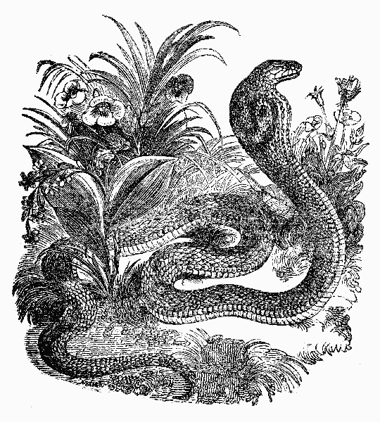 The serpents of South Africa, commonly accounted the most dangerous, are the Cobra-Capello, (or hooded snake,) the Puff-Adder, and the Berg-Adder (or mountain snake.) The first of these is exceedingly fierce and active, and sometimes, it is said, attains the formidable length of ten feet; I have, however, never met with any of much more than half that size. The Cobra has been known to spring at a man on horseback, and to dart himself with such force as to overshoot his aim. The Puff-Adder, on the other hand, is a heavy and sluggish animal, very thick in proportion to its length, and incapable, when attacked in front, of projecting itself upon its enemy. To make amends, however, it possesses the faculty of throwing itself backward with perilous and unexpected effect; but its disposition is inert, and unless accidentally trod upon or otherwise provoked, it will seldom attack mankind. The Berg-Adder, though much smaller in size than either of the preceding, is generally considered not less deadly, and it is the more dangerous from its being less easily discovered and avoided.