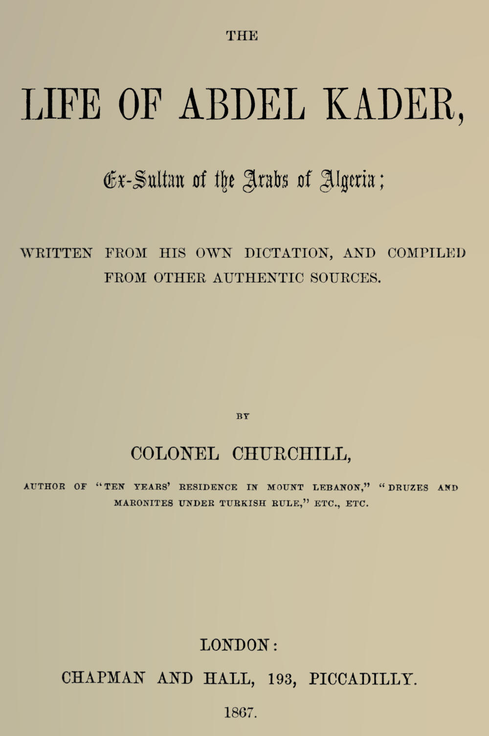 Abdel Kader Nusr-ed-deen, fourth son of Abdel Kader Mehi-ed-deen, was born in the month of May, 1807, at the paternal ketna, or family village, on the banks of the river Hammam. This locality lies in the district of Eghrees, appertaining to the province of Oran, in Algeria.