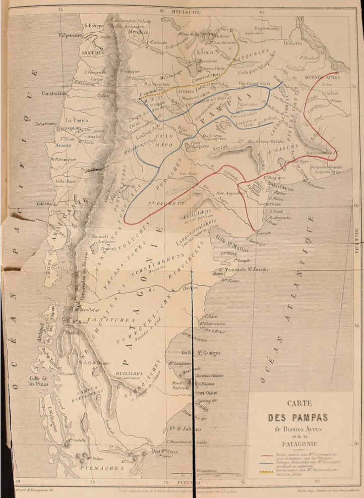 A l'époque où le soleil ne se couchait pas sur les domaines des monarques espagnols, les vastes plaines qui se déroulent entre Buenos-Ayres et le détroit de Magellan, d'un côté, et de l'autre, entre l'Atlantique et les Andes jusqu'à Mendoza, était censé faire partie de la vice-royauté de la Plata, bien que la plupart des Nomades qui les occupaient fussent alors, comme à présent, libres de tout joug. Aujourd'hui une ligne fluctueuse, déterminée, à l'est, par la Cordillière de Médanos et le Rio-Salado, au nord, par le Rio-Quinto, le Cerro Verde et le cours entier du Diamante qu'elle remonte jusqu'au sein des Andes, forme la limite commune de la Confédération[Pg 42] Argentine et de la Pampa indépendante; au sud du Rio Négro commence la Patagonie.
