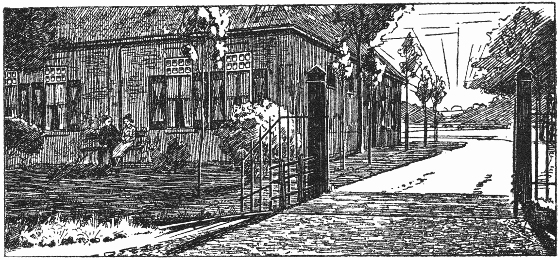 Het was een kapitale boerenplaats. Het huis was breed en hecht en miste het schilderachtige van een vervallen, ouderwetsche boerderij, maar de Wije’s waren menschen van praktische geaardheid en van vooruitgang, menschen, die meer hechtten aan het comfort van een moderne behuizing dan aan het dikwijls meer artistieke aspekt eener bouwvallige hoeve. Toch droeg het geenszins een stempel van ongezellige nieuwheid; het stond dan ook reeds een goede tien jaren en het lag volstrekt niet zonder bekoring onder het lommer van een paar hooge noteboomen, afgesloten van den weg door een flinken vóórtuin [17]met in het voorjaar en in den zomer bloeiende heesters en meidoornstruiken.
