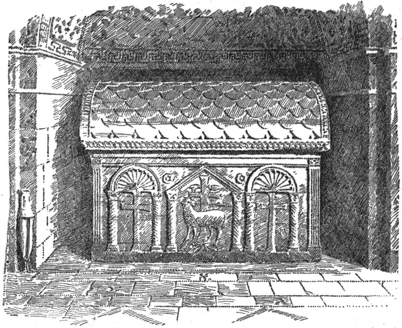 The sarcophagus which contained the body of S. Petronilla rested in its original position in the Basilica of Siricius until A.D. 787, when it was removed to one of the little Rotunda Chapels which once stood adjacent to the south side of the great Church of S. Peter on the Vatican Hill. The reason for this first translation is singularly interesting, and shows in a remarkable way the deep veneration in which the remains of the daughter of S. Peter were held. S. Peter was specially honoured by the Frankish nation, and S. Petronilla his daughter, sharing in this special devotion, was styled by Pope Paul I, circa A.D. 757, the “auxiliatrix” of Pepin, the king of the Franks, and when Pope Stephen II, circa A.D. 752, was on a visit to Pepin’s court, he promised as a pledge of the alliance between the Papacy and the Franks against the Lombards, to remove the body of S. Petronilla, who was evidently[142] specially venerated by the Frankish people, of course owing to her illustrious parentage, from the Basilica of Siricius on the Via Ardeatina, where it was exposed to the profanities of Barbarian raiders, to the more secure shelter of the walls which protected the Church of S. Peter.