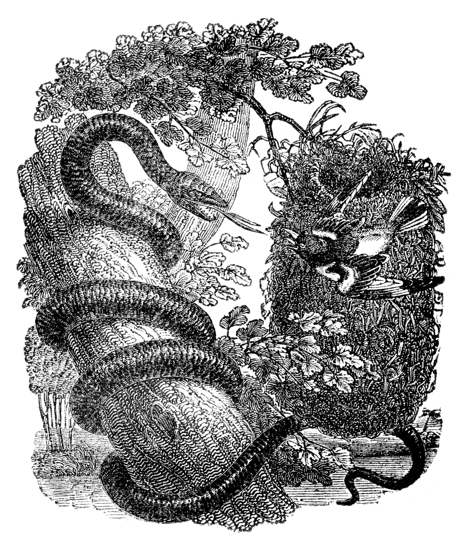 “I have already observed, that the rattle-snake does not climb up trees; but the black snake and some other species of the coluber do. When impelled by hunger and incapable of satisfying it by the capture of animals on the ground, they begin to glide up trees or bushes upon which a bird has its nest. The bird is not ignorant of the serpent’s object. She leaves her nest, whether it contains eggs or young ones, and endeavours to oppose the reptile’s progress. In doing this, she is actuated by the strength of her instinctive attachment to her eggs, or of affection to her young. Her cry is melancholy, her motions are tremulous. She exposes herself to the most imminent danger. Sometimes she approaches so near the reptile that he seizes her as his prey. But this is far from being universally the case. Often she compels the serpent to leave the tree, and then returns to her nest.