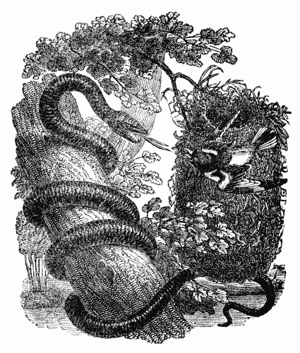 “Some years since, Mr. Rittenhouse, an accurate observer, was induced to suppose, from the peculiar melancholy cry of a red-winged maize-thief, that a snake was at no great distance from it, and that the bird was in distress. He threw a stone at the place from which the cry proceeded, which had the effect of driving the bird away. The poor animal, however, immediately returned to the same spot. Mr. Rittenhouse now went to the place where the bird alighted, and, to his great astonishment, he found it perched upon the back of a large black snake, which it was pecking with its beak. At this very time the serpent was in the act of swallowing a young bird, and from the enlarged size of the reptile’s belly it was evident that it had already swallowed two or three other young birds. After the snake was 278killed the old bird flew away. Mr. R. says, that the cry and actions of this bird had been precisely similar to those of a bird which is said to be under the influence of a serpent. The maize-thief builds its nest in low bushes, the bottoms of which are the usual haunts of the black snake. The reptile found no difficulty in gliding up to the nest, from which most probably, in the absence of the mother, it had taken the young ones; or it had seized the young ones after they had been forced from the nest by the mother. In either case the mother had come to prevent them from being devoured.”