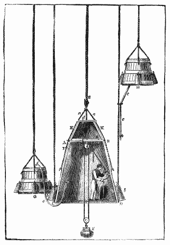 A, B, C, D, represents the body of the bell, which is suspended by four ropes, a, a, uniting together at their junction with the great rope E. b, b, ballast weights; these keep the mouth of the bell, C, D, always parallel to the surface of the water. By these weights alone, however, the bell would not sink; another is therefore added, F, which by means of a pully can be raised or lowered at pleasure. In descending, this balance weight hangs considerably below the bell. In case the edge of the bell is caught by any obstacle, the balance weight is immediately lowered down, so that it may rest upon the bottom. By this means the bell is lightened, and all danger of oversetting is removed; for being lighter without the balance weight than an equal bulk of water, it is evident that the bell will rise as far as the length of rope affixed to the balance weight will permit. This weight, therefore, will serve as a kind of anchor, to keep the bell at any desired depth. Instead of wooden seats, ropes are used suspended by hooks across the bottom of the bell; and on these the diver stands. Two windows, made of strong thick glass, are fixed near the top of the bell, G, H, two air-casks with their tackle, and c, c, the flexible pipe, through which air is admitted to the bell; each cask contains forty gallons. I, is a cock by which hot air is discharged as often as it becomes troublesome, and a fresh supply is obtained from the air-casks.