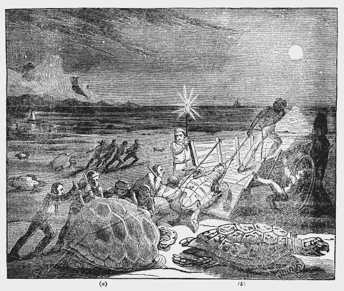 “In spite of the darkness which is chosen by the female tortoises for concealment when employed in laying their eggs, they cannot effectually escape from the pursuit of their enemies: the fishers wait for them on the shore, at the beginning of the night, especially when it is moonlight, and, either as they come from the sea, or as they return after laying their eggs, they either dispatch them with blows of a club, or turn them quickly over on their backs, not giving them time either to defend themselves, or to blind their assailants, by throwing up the sand with their fins. When very large, it requires the efforts of several men to turn them over, and they must often employ the assistance of handspikes or levers for that purpose. The buckler of this species is so flat as to render it impossible for the animal to recover the recumbent posture, when it is once turned on its back.