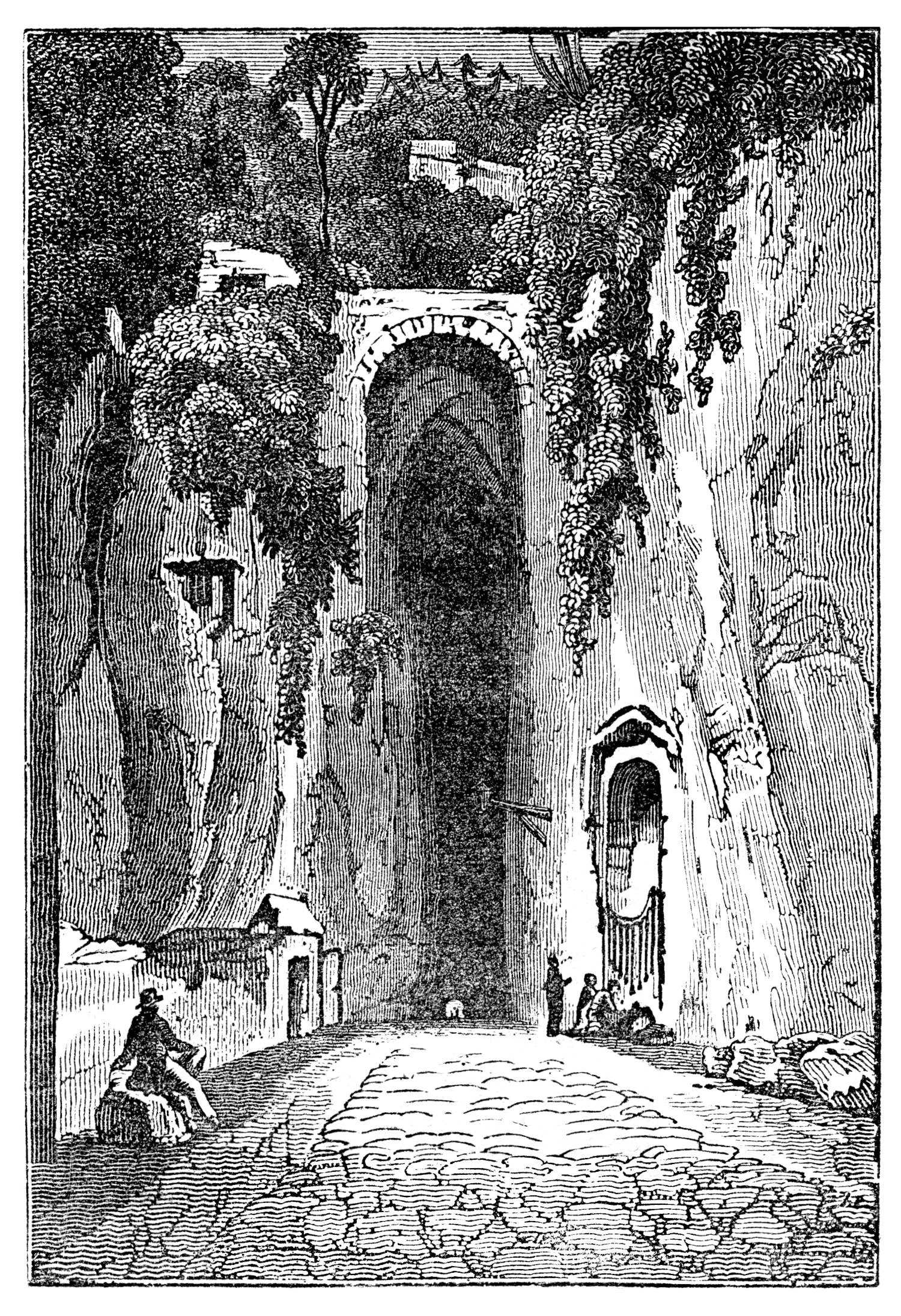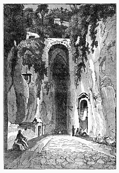 The catacombs of Naples, whose entrance is under the hill of Capo-di-Monte, and the grotto of Posilippo, at the extremity of the western suburb of the city, are also remarkable objects. The first are of great extent, and contain many curious specimens of painting and subterranean architecture by the early Christians, and an appalling mass of human skulls and bones, the relics of the victims of a plague that depopulated Naples some two centuries back. The second is a subterranean passage cut through the hill of Posilippo in remote antiquity, but enlarged and improved as a road in modern times. It is considerably more than half a mile long by twenty-four feet broad; its height is unequal, varying from twenty-five to sixty feet: it is well paved with large flags of lava. By night, it is now tolerably well illuminated by lamps suspended from its rugged roof, but by day the “darkness visible” that reigns through the passage renders it always solemn and sometimes embarrassing. Being the only frequented road to and from the town of Pozzuoli, Baia, Cuma, and other places, there is seldom a lack of passengers; and their voices, as they cry to each other in the dark, and the noise of their horses’ tread and of the wheels of their waggons, carriages, and gigs, echoing through the grotto and the deep vaults which in many places branch off from it laterally, produce to the ear of the stranger an effect that is almost terrific. Immediately above the entrance to the grotto, coming from the city, stands on a romantic cliff, which has been in part cut away to widen the approach to the subterranean road, an ancient Roman tomb in almost perfect preservation. This tomb is supposed to have been that of the great poet Virgil, and is visited as such by every traveller. Its claim has been questioned in vain; mankind are attached to such pleasant illusions, (if this be one, which we by no means decide,) and continue from age to age to crowd to the spot. A laurel once flourished by the side of the venerable sepulchre and covered its roof; but the successive thousands and thousands of visitors, each anxious for a memorial gathered in such a spot, have not left leaf, branch, stem, or root of the sacred tree.