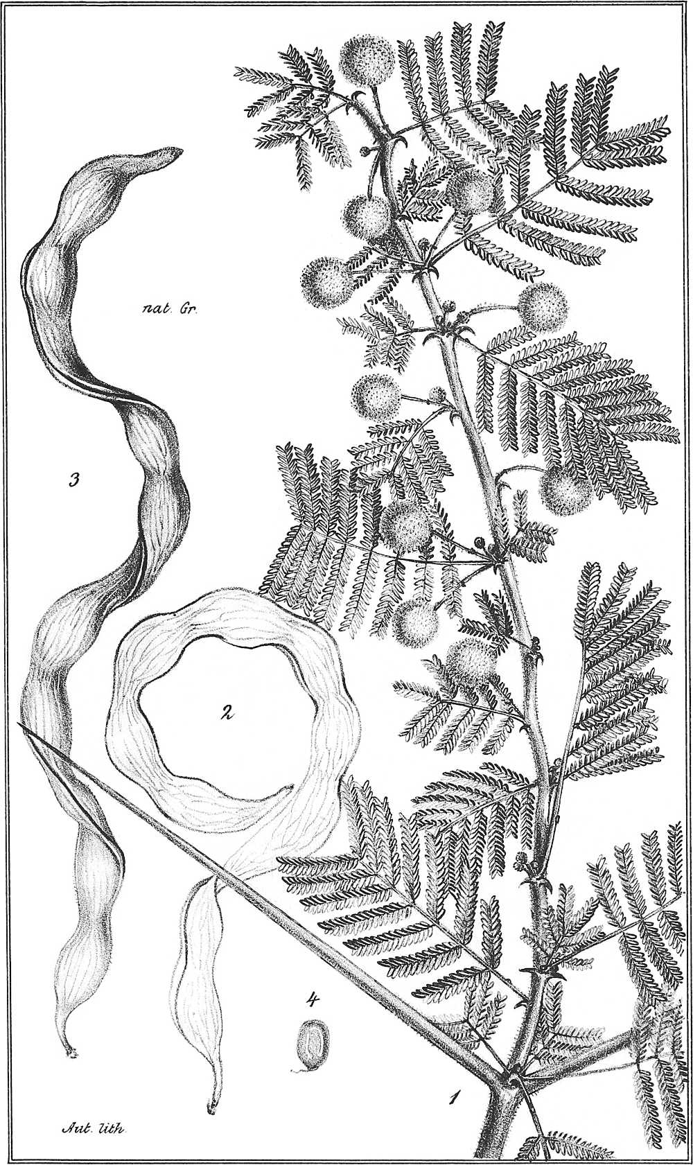 Arbor media trunco erecto cortice griseo-rimoso in ramis pallidiore in novellis albido striato tomentoso; aculeis ternatis, infrastipularibus atris nitidis ad apicem ramorum lucidis plus minus nunc deorsum nunc sursum curvatis, infrafoliaceo aequali recurvo; foliis cinereo-viridibus uncialibus junioribus tomentoso-villosiusculis 3-5-jugis, foliolis 10-15-jugis parvulis linearibus longitudine latitudinem 4-5-superantibus acutiusculis, petiolo communi basi apiceque glandula parva ornato; inflorescentia coaetanea folia paullo antecedente spicis 3-pollicaribus folia multo superantibus albidis in axillis singulis interdum 3-aggregatis; leguminibus 3-4-pollicaribus linearibus membranaceo-coriaceis pallidis[375] basi attenuatis apice acutiusculis planis tenuissimis transverse venosis marginibus parallelis vel saepius undulatis interdum valde constrictis 5-6-spermis; seminibus subrotundis valde compressis aeque longis ac latis interdum latioribus quam longis linea arcuata concava medio notatis.