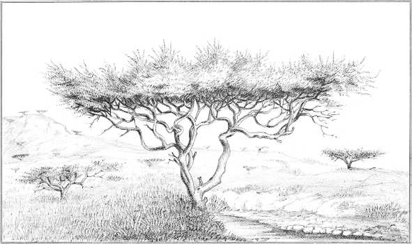 Da waren es denn auch vorzugsweise die Acacien, welche als treue Begleiter auf allen seinen Wegen dem Reisenden bald sympathisch wurden, so wenig auch anfänglich ihr Aeusseres Einladendes zu besitzen schien. Indess es erging ihm hier wie mit den rohen Bewohnern jener Gegenden, welche, entsprechend dem allgemeinen Charakter ihrer heimathlichen Natur, bald abstossend durch Misstrauen und Fanatismus sich des Fremdlings erwehrten, wie die Dornen der Acacien, oder wie letztere da, wo sie gebogen und gekrümmt erscheinen, sich mit bettelhafter Zudringlichkeit an seine Fersen hefteten. Auch hier gab es noch Mittel, um sich, über die rauhe Aussenseite hinwegsetzend, mit den Vorzügen ihres besseren Ichs vertraut zu machen. Ein fortgesetzter Umgang mit ihren Dornen und Stacheln gab dem Reisenden solche an die Hand, Kratzwunden an Armen und Beinen lehrten denselben seine Gewandtheit verdoppeln, um sich ihren unsanften Umarmungen zu entwinden, zerrissenen Kleidern verdankten solche von starrem Leder ihre Entstehung, und zu den allen Attaquen hohnsprechenden Dornenkronen bahnte ihm schliesslich ein Taschenmesser den Weg, behutsam Dorn für Dorn mit demselben entfernend; kurz und gut, wie die Klaue der Katze nichts Gefährliches mehr an sich hat, wenn man sie nur richtig zu nehmen weiss, so wurden mit der Zeit auch die Acacien des Reisenden trauteste Freunde, spendeten ihm mit Hülfe eines über ihr blattloses Gestell gespannten Tuchs selbst Schatten inmitten der ödesten Wüste, oder vertheidigten an anderen Orten die Eingänge seines Lagers gegen die Zudringlichkeiten nächtlicher Räuber.
