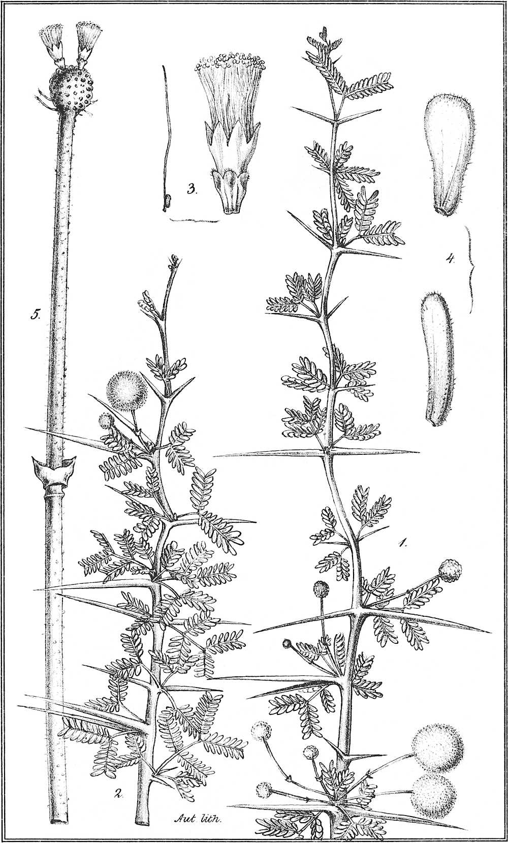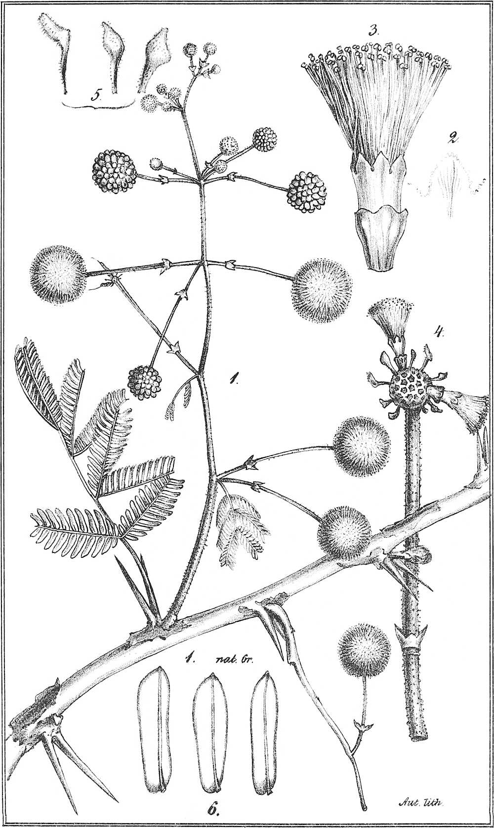 Obgleich ich nicht der von den Autoren der Flora des Senegals vertretenen Ansicht, als sei A. Senegal W. ein Synonym der A. albida D., beipflichten kann (da die Willdenow’sche Diagnose ausdrücklich von 3 Stacheln spricht, „spinis ternis intermedio reflexo“), so will ich dennoch, um Irrungen zu vermeiden und da sich hierüber keine Gewissheit erlangen lässt, den von den Negern am Senegal gebrauchten Namen Verek für diese Art aufrecht erhalten.