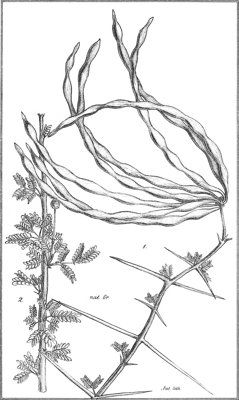 So bilden denn auch im Nilgebiete die Acacien, soweit wir den Ufern des grossen Flusses nach Süden zu folgen wollen, oder so fern von demselben wir uns auch seitwärts in die anstossenden Gebiete hineinwagen, mit den wichtigsten Bestandteil der Baumflora. Die Wüstenthäler entlang erreichen wir in ihrer steten Gesellschaft das Meer, oder ziehen durch die mit ihnen wie übersäeten Steppenwüsten, durchdringen ihre buschreichen Dickichte meilenweit innerhalb hochgrasiger Prairien und stossen schliesslich auf sie, eine ebenbürtige Zierde des Tropenwaldes, als Genossen von Tamarinden- und Feigenbäumen.