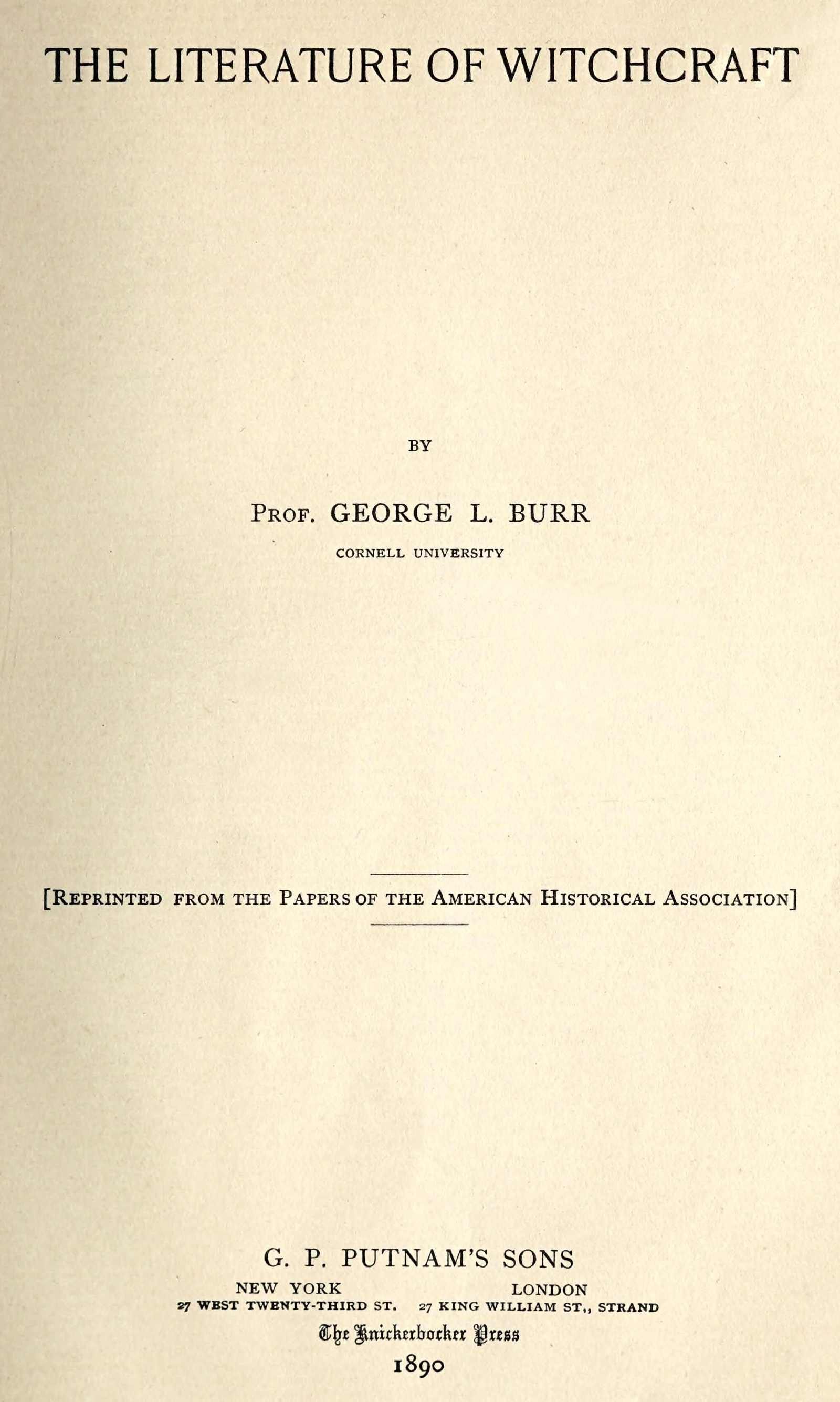 But witchcraft never was. It was but a shadow, a nightmare: the nightmare of a religion, the shadow of a dogma. Less than five centuries saw its birth, its vigor, its decay. And this birth, this vigor, this decay, were—to a degree perhaps else unknown in history—caused by and mirrored in a literature. Of that literature it has during the last decade been mine, as librarian of the President White Library at Cornell University, to aid in building up a collection. In the last few months I have had in hand the making ready of its catalogue for the press. My task is by no means finished, and I have much to learn; but it has seemed to me that even such a hurried survey of the literature of witchcraft as I may presume to attempt may not be without interest to the American Historical Association. And this the more, since no adequate bibliography of it has ever yet been published, and no historian has thoroughly known and exploited it.