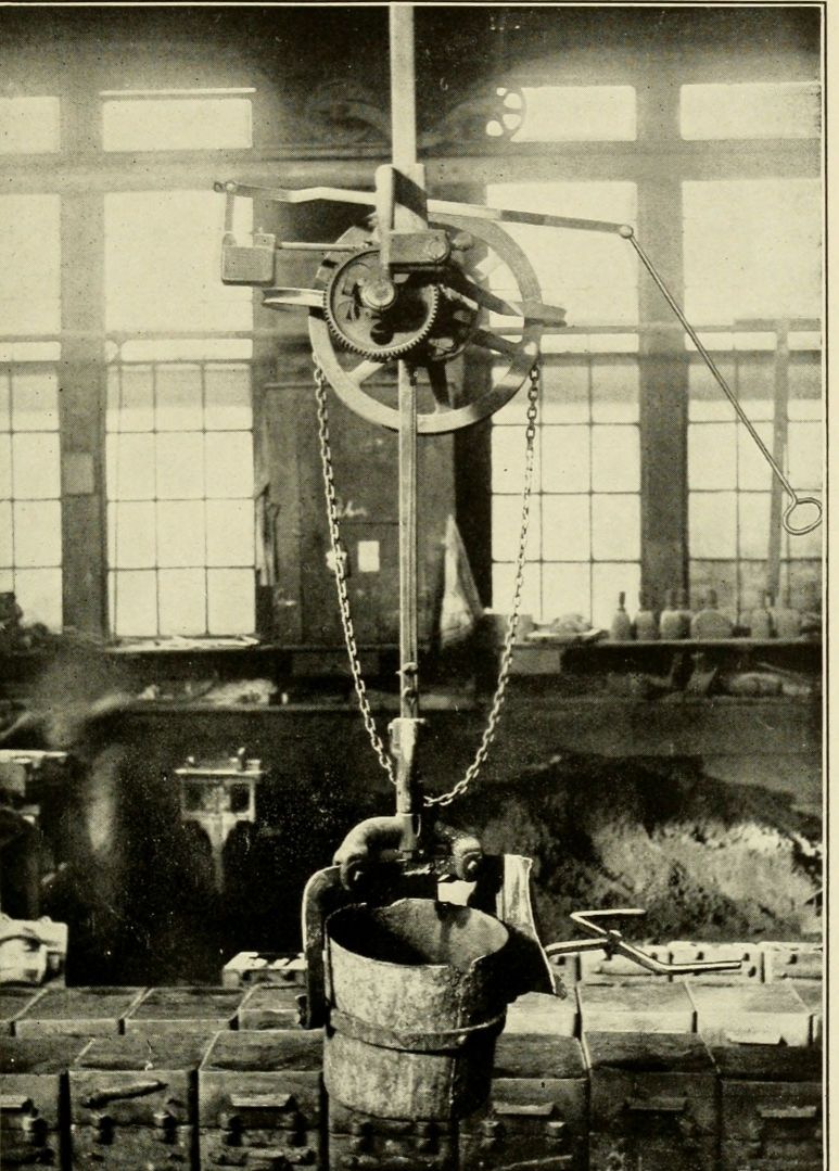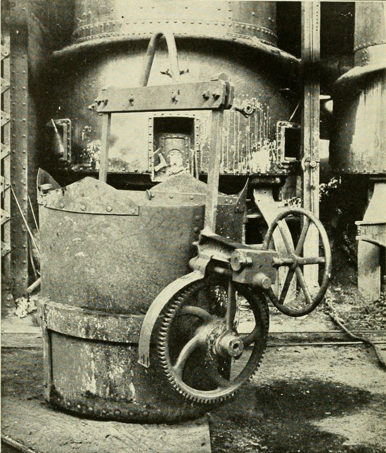 Reservoir ladles and all other ladles operated by gearing should receive special attention. The motors of motor-operated ladles should be completely inclosed, not only to protect the workmen against electric shocks and burns, but also to prevent accidents which might be caused by metal being spilled upon the motors, resulting in short circuits or other kinds of trouble. All the gears on geared ladles should be completely inclosed, the covers or guards being constructed in such a way that they may be readily removed for oiling, cleaning, and inspecting the various parts. If guards are[Pg 6] not provided the gears will soon become clogged with dirt and with metal that has hardened or set after having been spilled upon them while in a molten state; and clogged gears are likely to be broken or stripped, and to cause serious accidents.