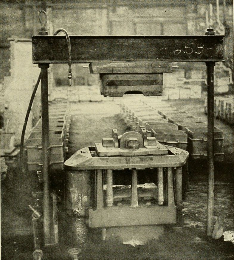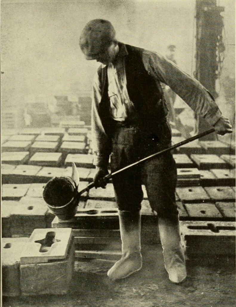 Sulky and buggy ladles are used only to a limited extent, but they cause many accidents. In some foundries steel plates are laid to serve as runways for buggy ladles, and plates are often placed between the[Pg 8] rails of narrow-gage industrial railway tracks also. Molten metal is sure to splash when spilled on clean, smooth plates of this kind, and it also forms into “shot” which roll under the feet and cause the men to fall or to spill more metal. The danger from splashing might be minimized by sprinkling sand on the floor, but the sand would hinder the free movement of the wheels, and greater effort would be required to move the buggies. This would tend to make spills more frequent, even though in any individual case the sand might reduce the likelihood of injury from splashing, after the metal had been spilled. Floors of concrete and brick have been tried in other foundries, with the result that[Pg 9] the number of burns from spills has been materially reduced. An excellent floor may also be constructed of metal plates with checkered surfaces,—the elevations on these plates providing a surface that is sufficiently smooth for the wheels, while the depressions (which are filled with sand) tend to check the splashing. Overhead trolley systems are used in some foundries for transporting ladles, and in this way the spills and splashes that are due to poor floor conditions are eliminated.