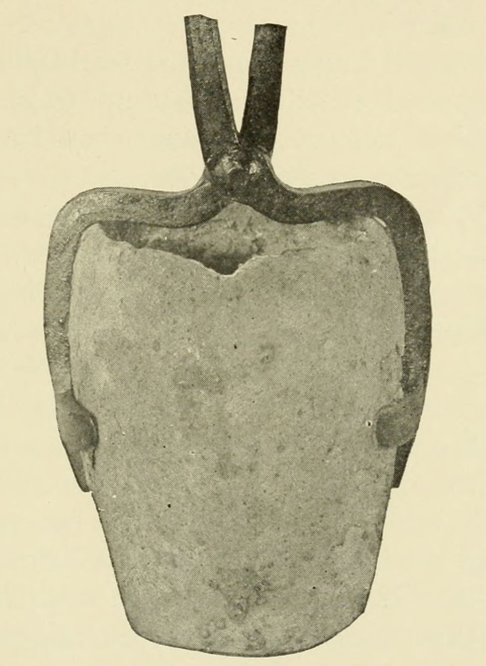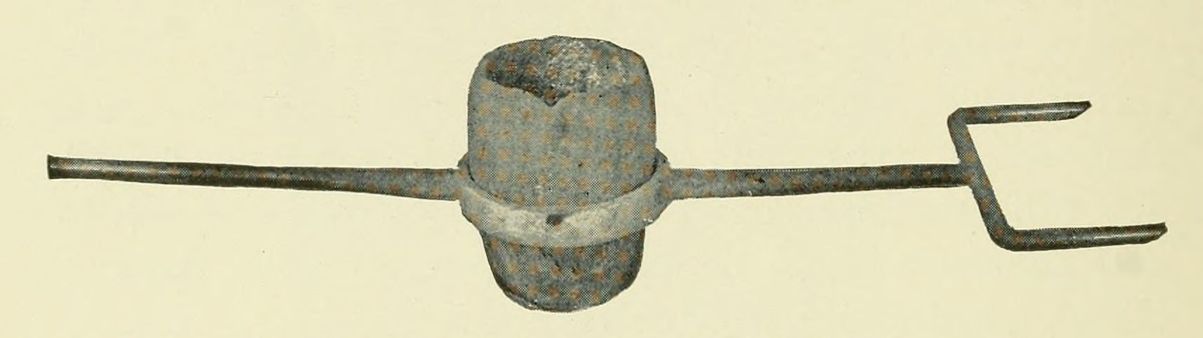 Bull ladles are much safer to handle than ordinary single-hand ladles, and should be used whenever possible. Several styles of shank-handles are used with bull ladles, one of them consisting of a rigid fork handle on one side and a rigid single handle on the other side. In another style (which is preferable) both handles are forked; and in still another form a swivel is provided at one end, which permits the ladle to be tilted more easily and emptied with less danger of spilling. The bowls of bull ladles should be held securely in position in their shanks by means of clamps made of round or flat iron. The shanks must be amply strong for the[Pg 10] weight to be carried, and the joints should be carefully inspected for poor welding, flaws, and other weaknesses. Defective ladle shanks should be removed from the pouring floor as soon as discovered, so that there will be no possibility of using them again, either intentionally or otherwise. Ladle shanks should not be left exposed to the weather, because such exposure causes them to corrode and become weakened.