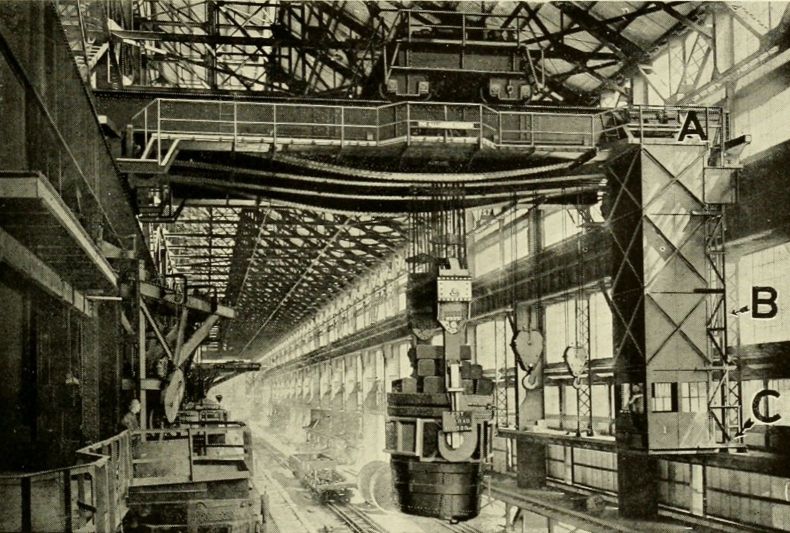 The safest way to store pig iron is to stow it in bins, or pile it up in neat stacks. This is more costly, however, than throwing it down promiscuously in piles, and hence the safer methods are often neglected. Electromagnetic cranes are coming into wide use for handling pig iron, and although they are very convenient, they have serious drawbacks when regarded from the safety standpoint, and their hazards should be clearly understood and carefully avoided. When the electromagnet is used no one should be permitted to stand, walk, or work near the path followed by the magnet, because any interruption of the electric[Pg 64] service, from the opening of a switch, the blowing of a fuse, the short-circuiting of the magnet coil, or any other cause, will instantly let the whole load drop. Sometimes, too, a pig is barely held by the magnet, so that the least jar will break its contact and allow it to fall.