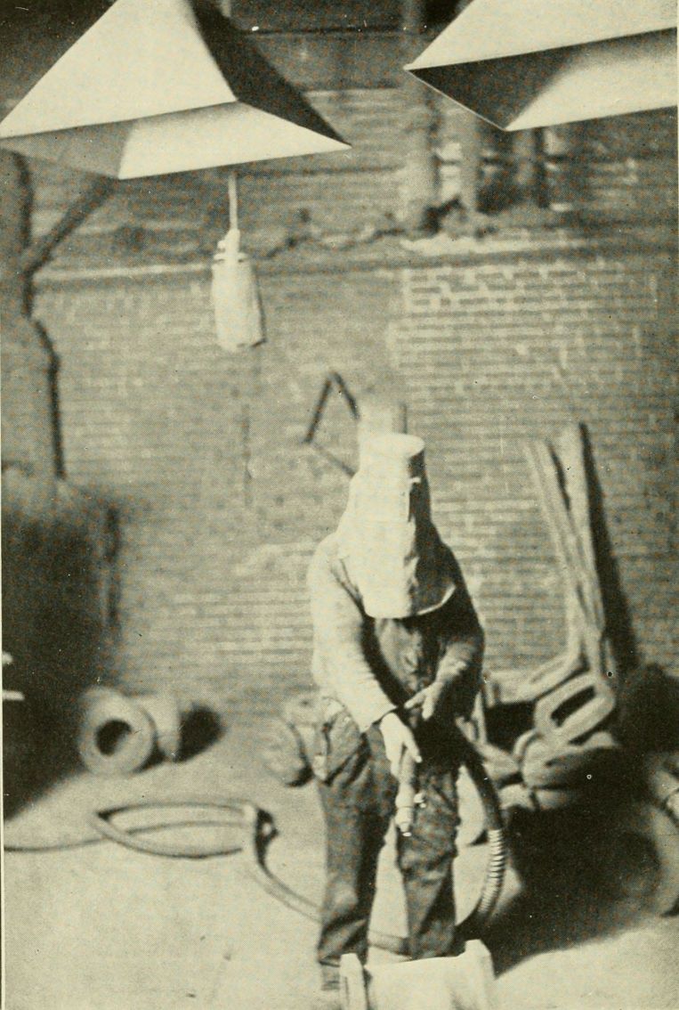 Sand-blasting may be done in the open air if eye-protectors and respirators are worn and other suitable precautions are taken, but it is far better to provide a dust-proof chamber for this work. The operator of the sand-blast should then wear an appropriate helmet, to effectively protect his lungs and eyes from the dust. The form of apparatus used should be adapted to the work to be done, and to the conditions that must be met. Considered from the point of view of the dust hazard alone, the ideal arrangement appears to consist in a helmet well ventilated by means of a hose supplying an adequate flow of dust-free air. The hose may be run from the compressed-air tank to the upper part of the helmet, and it should be provided with a regulating valve located where it may be easily controlled by the man who is to be supplied. The air current should be so adjusted that it will not only afford sufficient oxygen to serve for respiration, but also prevent dust from rising into the helmet through openings in the lower part of it. In practice, however, it is frequently found that the plan[Pg 55] here outlined is highly objectionable to the men, and in fact they often refuse to wear apparatus of this type, claiming that the cool air passing down the neck soon causes them to catch cold. Baffles and various other distributing devices to regulate the flow of the air within the helmet have been tried, but no ideal and wholly satisfactory solution of the difficulty has yet been worked out, so far as we are aware. In the[Pg 56] opinion of certain foundry experts, an ordinary helmet with a respirator attached, or used in conjunction with a separate respirator, constitutes the best device for the protection of the sand-blaster, when all phases of the problem are considered.