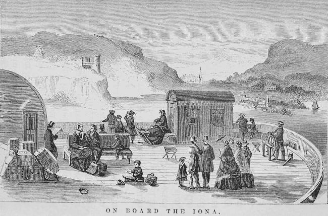 Mrs. Morelle did not gain much advantage by keeping back and walking slowly, for when at length she reached the landing place, she found the bull standing there surrounded by people. There were also some curious-looking boxes there, of the form of stalls for cattle, but Mrs. Morelle did not stop to look at them, being in haste to go past the bull and get into the boat. She effected this object safely. A number of other passengers went on board the boat at the same time. Their luggage was also put in, and then the boatmen pushed off, and rowed out to the steamer.
