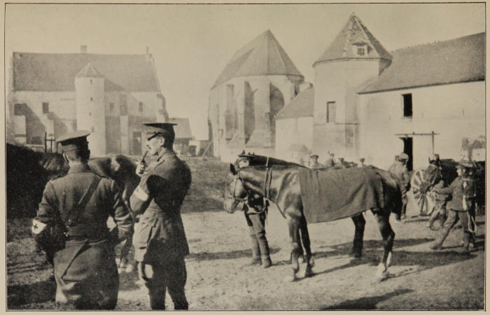 On the march from the Aisne to La Bassée, our Field Ambulance bivouacked at the Château of Longpont. The Comte and Comtesse de M—— were in residence at the château, and we were told by the Comtesse that General von Kluck, commanding the right wing of the invading army, had in August stopped for a day and a night at the château with his état-major. We asked how Von Kluck had behaved, and the Comtesse said that he had been très agréable. When he arrived, she interviewed him and begged him to respect the old château and its old abbey, the pictures and the tapestries. The General promised that he would do so, and that he would give orders that the villagers in the hamlet near the château gates were not to be molested. It was the apple season, and the apple trees of Longpont were laden with delicious fruit. Von Kluck “asked permission” of the Comtesse for his soldiers to take some apples off the trees. This the Comtesse graciously permitted, and the dusty German soldiery helped themselves to the apples and did not break a branch off a single tree.