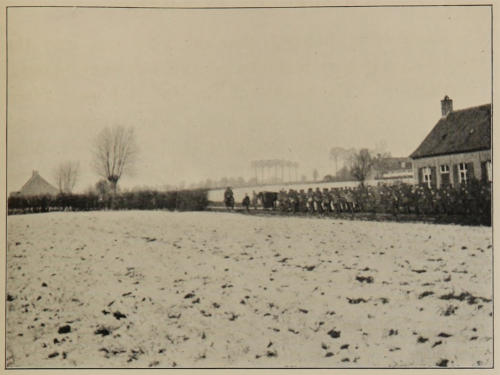On this lovely winter morning, when the whole countryside was white with frozen snow, we had a sharp bracing walk to the curious old town, then the headquarters of General B—— and his staff of a French Division. The village streets were packed full of French and Belgian soldiery, from Spahis to Alpine Chasseurs. We worked our way round the carts and through the jostling men to a little shop opposite the church. Monsignor was hailed joyfully by many of his old friends, who on this particular morning were not working on the roads.