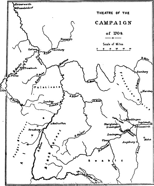 [7] Coxe, though a dull is a conscientious writer, and occasionally he had good military assistance. Alone, as far as I know, of commentators on the campaign of 1704, he points out the risk to which, at this juncture, Eugene and Marlborough were exposed. Napoleon wrote on Marlborough, but his observations have never been published; it would be most interesting to know his judgment on this passage in the campaign.