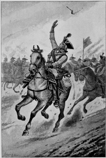 It was nearly 3 P.M., and Napoleon’s prospects, which had appeared so brilliant, had become clouded. Bülow had moved forward from Chapelle St. Lambert; Lobau, greatly outnumbered, was falling back; a messenger had arrived from Gembloux announcing that Grouchy was miles distant; and Wellington had completely maintained his position. It is difficult to determine what, in this state of affairs, was the exact purpose formed by Napoleon; but he probably resolved to watch the movement of Bülow; and renouncing his attack on the Duke’s left, which would seriously endanger his own right, he turned against the British centre, for the present suspending a decisive effort. Ney was ordered to seize the advanced post of La Haye Sainte, and the place was mastered at about 4 P.M.,[54] after a furious and well-contested struggle, in which the French cavalry made their power manifest. A gap was now opened in Wellington’s front; guns were brought up to bear on his line; a part of his troops fell back for shelter behind the crest of his main position. Napoleon seems to have believed in the beginning of a retreat, and he directed a large part of his cavalry reserve, with Ney at their head, to advance on the enemy, his purpose being, it seems probable, to sustain the movement by the Imperial Guard. The French horsemen advanced in superb confidence; carried the eminences held by the hostile infantry, and sent terror into the hearts of the inferior troops who crowded the ranks of the Duke’s army, though checked by the squares of the British and German footmen, who exhibited the most heroic constancy. It seems now certain that Napoleon meant to follow up this partial success, when a diversion caused[353] him to forego his purpose. Bülow had hesitated to make a serious attack; but Blücher had joined his halting lieutenant, and the fiery veteran, seeing how critical[55] was the situation of Wellington’s army, ordered an immediate advance on Napoleon’s flank. The Emperor was now fighting two battles; his attention was for some time engrossed in repelling Bülow’s attack on his right; and this, indeed, became so formidable that a considerable part of the Imperial Guard was required to stem the enemy’s progress. Ney, meanwhile, had been making desperate efforts with his cavalry to break the British centre; he employed the last reserve of this splendid force, undoubtedly against his master’s wishes;[56] but though Wellington’s line had been severely shaken, and thousands of fugitives covered his rear, and enormous gaps had been made in his army, the enemy’s cavalry, unsupported by foot, were unable to force the British position, held by squares “rooted,” it has been said, “in the earth.”