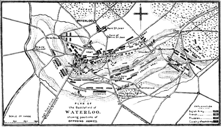 Napoleon, meantime, had been preparing a grand and decisive attack on Wellington. His army had been some time in motion to take the positions assigned to it, when he sent off by Soult a message to Grouchy, at this moment on his way from Gembloux. In this letter, written at 10 A.M., the Chief of the Staff informed Grouchy that, besides the two columns the Marshal had mentioned, intelligence had been received of a third Prussian column falling back on Wavre by Gentinnes; and he approved of Grouchy’s intended march on Wavre—inferred from the despatch of 2 A.M.—but he enjoined him to approach the Emperor, and to enter into communication with the main French army, which, he added, was about to engage in battle “near Waterloo,” before “the Forest of Soignies.” By 11 A.M., Napoleon’s legions had taken their ground on their last field, and the annals of war have seldom presented so magnificent and imposing a spectacle, described by the Emperor himself in most striking language. The French army, spread out[349] like a gigantic fan, resplendent in all the pomp of battle, was formed into three great masses; the first, composed of the 2nd and 1st Corps, deployed in lines from Mon Plaisir on the left to near Frischermont on the extreme right; the second, a superb array of cavalry, in line, to the rear of Reille and D’Erlon; and the third, in close columns, made up of cavalry, of Lobau’s 6th corps, and of the Imperial Guard, intended to deal the decisive stroke. Napoleon’s position crossed two roads, one the great highway from Charleroi to Brussels, the other a good cross road from Nivelles running into the first at Mont St. Jean; and the three arms could concur in the attack, though his adversary’s front was protected by obstacles, and the rain of fifteen hours had made an attack difficult through dense fields of rye and miry enclosures. The Emperor rode in front of his line, accompanied by his gorgeous staff; exulting cheers burst from the martial host, proud of the renown of a hundred victories; and the sight, as Napoleon calculated, made a profound impression on the thousands of men in the hostile array who had but recently served under the Imperial eagles.