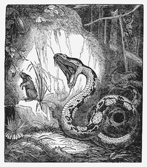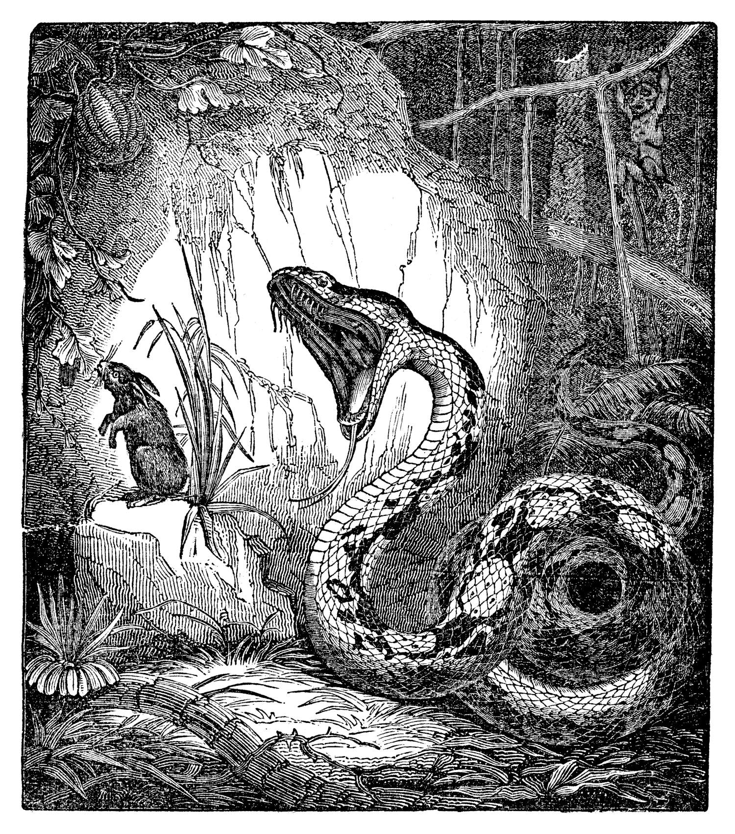 This serpent was of large dimensions, though not of the very largest. A living goat was placed in his cage. He viewed his prey for a few seconds, felt it with his tongue, and then, withdrawing his head, darted at the throat. But the goat, displaying a courage worthy of a better fate, received the monster on his horns. The serpent retreated, to return to the combat with more deadly certainty. He seized the goat by the leg, pulled it violently down, and twisted himself with astonishing rapidity round the body, throwing his principal weight upon the neck. The goat was so overpowered that he could not even struggle for escape. For some minutes after his victim was dead the serpent did not change his posture. At length he gradually slackened his grasp, and having entirely disengaged himself, he prepared to swallow the lifeless body. Feeling it about with his mouth, he began to draw the head into his throat; but the horns, which were four inches in length, rendered the gorging of the head a difficult task. In about two hours the whole body had disappeared. During the continuance of this extraordinary exertion the appearance of the serpent was hideous; he seemed to be suffering strangulation; his cheeks looked as if they were bursting; and the horns appeared ready to protrude through the monster’s scales. After he had accomplished his task, the boa measured double his ordinary diameter. He did not move from his posture for several days, and no irritation could rouse him from his torpor.