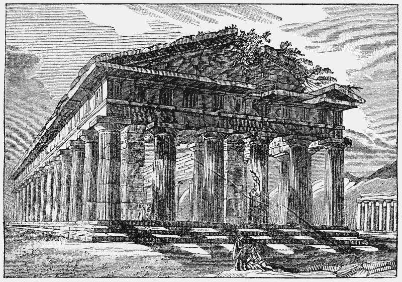 These edifices have been called, rather by caprice or conjecture than from any good grounds for such names, the Temple of Ceres, the Temple of Neptune, and the Basilica. That of Ceres, which is the smallest of the 293three, first presents itself to the traveller from Naples. It has six columns in front, and thirteen in length; the columns are thick in proportion to their elevation, and much closer to each other than they are generally found to be in Greek Temples, “which,” says Mr. Forsyth, “crowds them advantageously on the eye, enlarges our idea of the space, and gives a grand, an heroic air to a monument of very moderate dimension.”