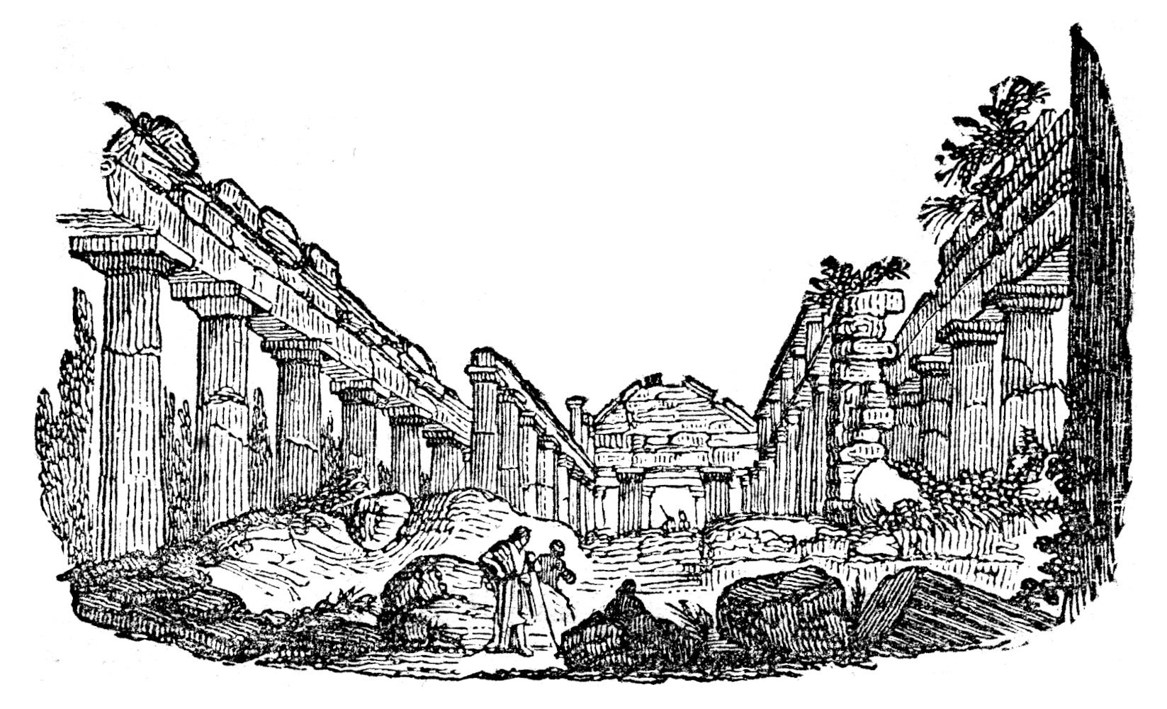 These sublime relics of antiquity stand on the edge of a vast and desolate plain, that extends from the neighbourhood of the city of Salerno to the mountains of the Cilento, or nearly to the confines of Calabria. The approach to them across this wild is exceedingly impressive. For miles and miles scarcely a human habitation is seen, or any living creature, save herds of savage-looking buffaloes, that range the lords of the waste. And when you are within the lines of the ancient walls of the town—of the once opulent and magnificent Pæstum—only a miserable little taverna, or house of entertainment, a barn, and a mean modern edifice belonging to the nominal bishop of the place, and nearly always uninhabited, meet your eye. But there the three ancient edifices rise before you in the most imposing and sublime manner—they can hardly be called ruins, they have still such a character of firmness and entireness. Their columns seem to be rooted in the earth, or to have grown from it! The first impression produced on the traveller, when he arrives at the spot, has often been described. Even the critical and sceptical Forsyth exclaims, “On entering the walls of Pæstum I felt all the religion of the place—I trod as on sacred ground—I stood amazed at the long obscurity of its mighty ruins!”