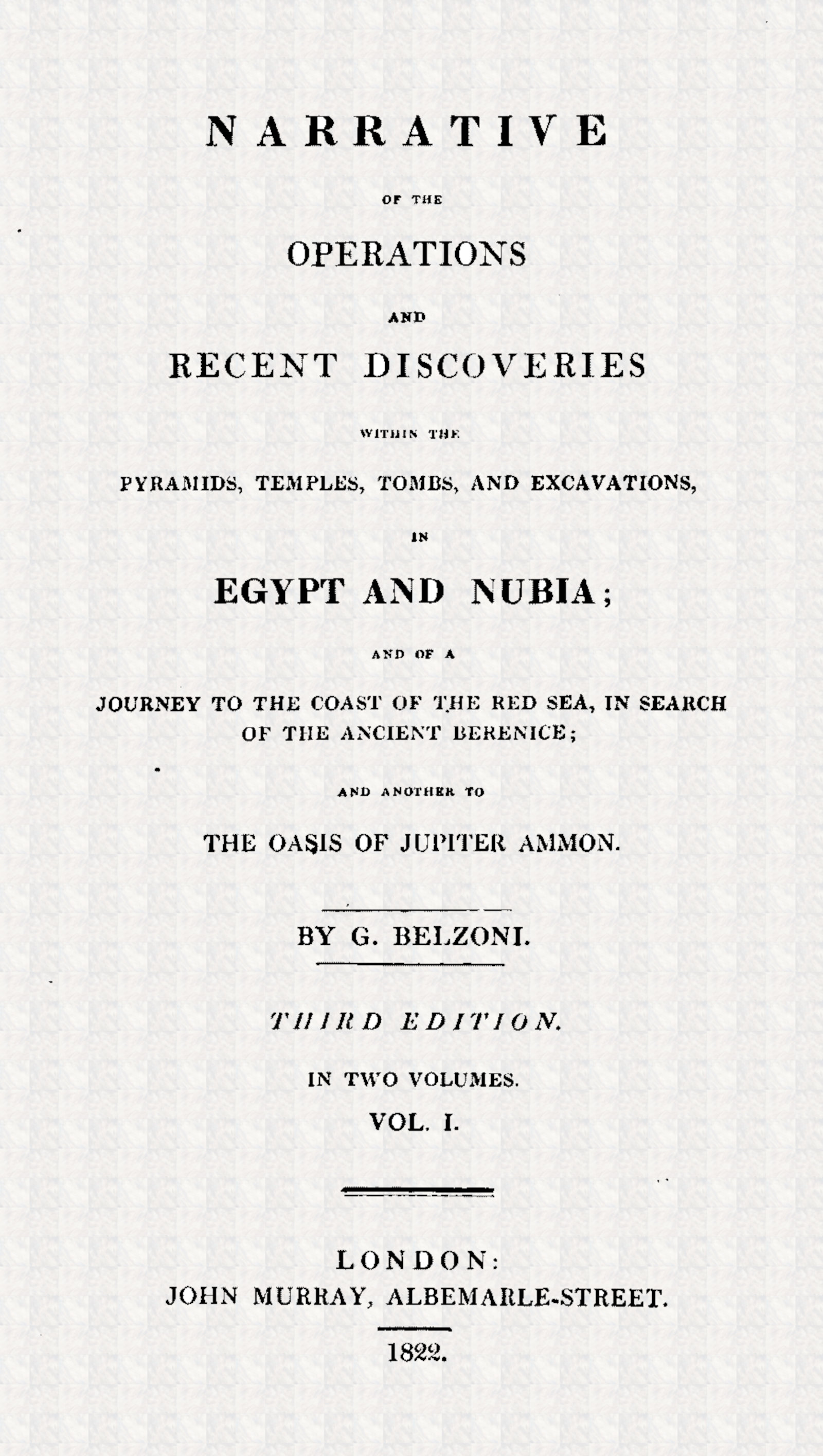 As I made my discoveries alone, I have been anxious to write my book by myself, though in so doing the reader will consider me, and with great propriety, guilty of temerity; but the public will perhaps gain in the fidelity of my narrative what it loses in elegance. I am not an Englishman, but I prefer that my readers should receive from myself, as well as I am able to describe them, an account of my proceedings in Egypt, in Nubia, on the coast of the Red Sea, and in the Oasis; rather than run the risk of having my meaning misrepresented by another. If I am intelligible, it is all that I can expect. I shall state nothing but the plain matters of fact, as they occurred to me in these countries, in 1815–16–17–18 viand 19. A description of the means I took in making my researches, the difficulties I had to encounter, and how I overcame them, will give a tolerably correct idea of the manners and customs of the people I had to deal with. Perhaps I have spoken too much of the obstacles thrown in my way, by the jealousy and intriguing spirit of my adversaries, without considering that the public will care little about my private quarrels, which to me, of course, appeared of the greatest consequence on the spot, in these countries. But I hope that a little indulgence may be allowed to my mortified feelings, particularly when I reflect that it was through them that I was compelled to leave Egypt before I had completed my plans.